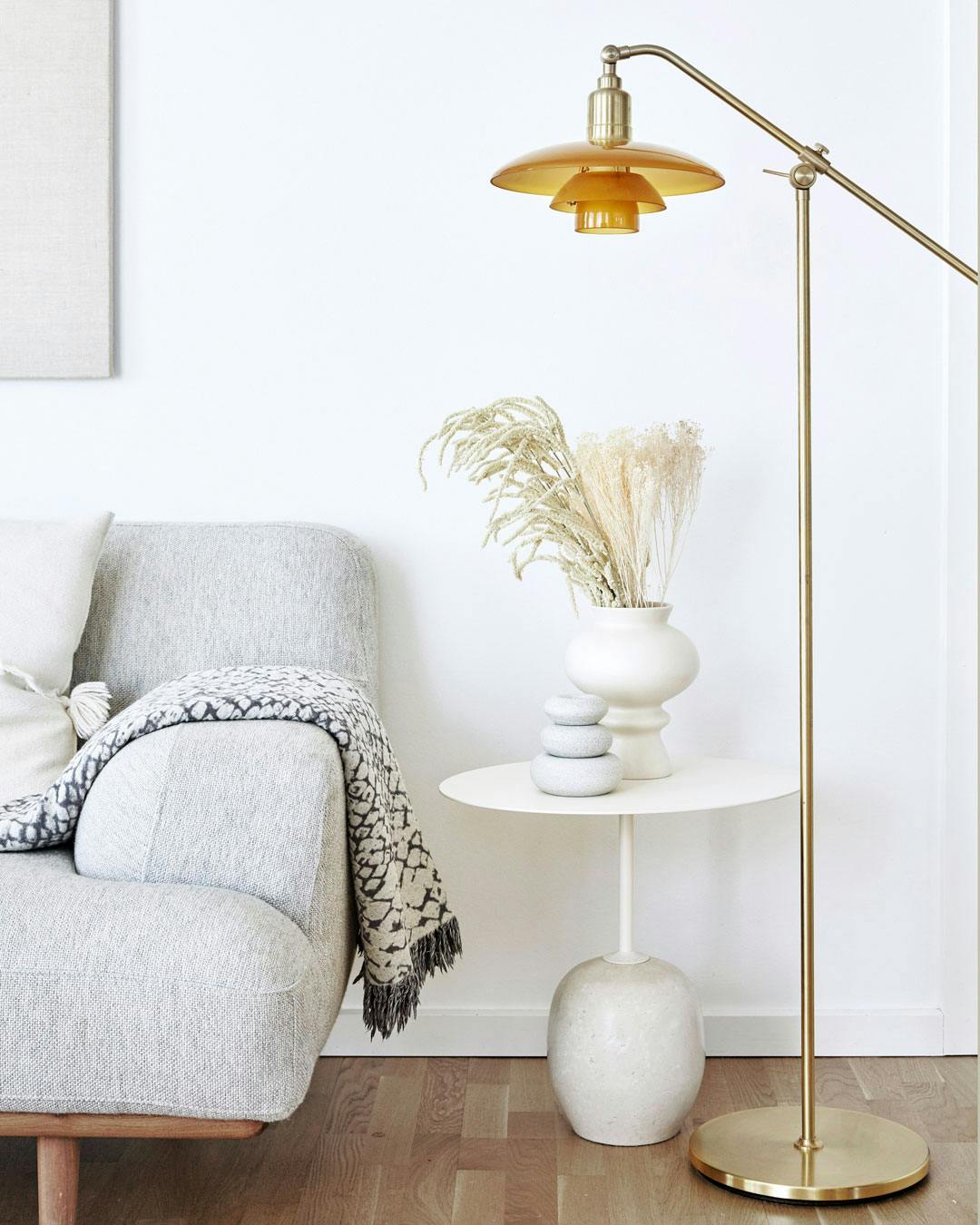 Lampen med skærm i røgfarvet italiensk glas er en sjælden udgave af Poul Henningsens klassiker PH 3/2 fra 1925, som kun blev forhandlet hos Louis Poulsen i to måneder i 2019. Det lille sidebord er fra &Tradition, vasen er fra Kähler, og den lille skulptur er af Ker.