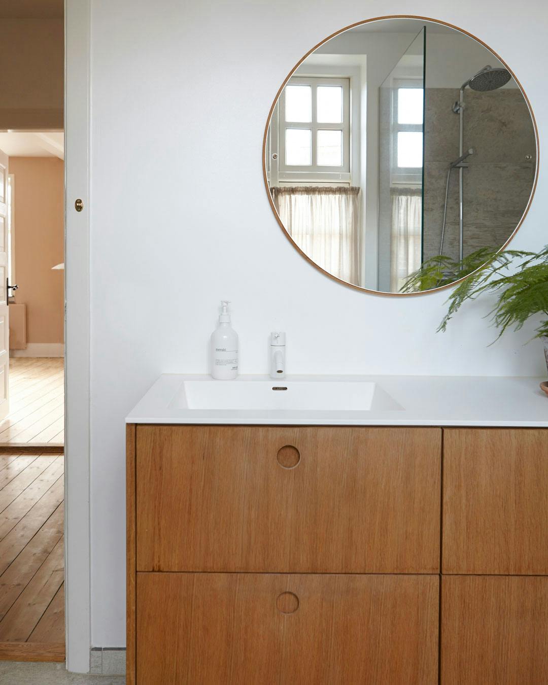 Giv badeværelset personlighed med et ældre møbel som her, hvor et træskab fra et loppemarked er blevet forsynet med en ny bordplade af corian og et armatur fra Vola. Det runde spejl fra Frama bryder rummets firkantede former.