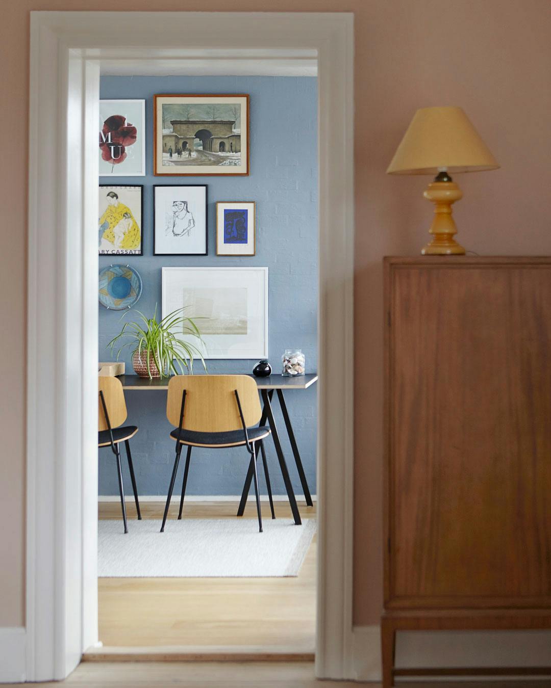 En billedcollage på væggen giver hjemmekontoret personlighed. Collagen består af kunstplakater, værker fra gallerier og et billede af huset, som fulgte med, da parret overtog det. Væggen er malet med farven Hav fra Dyrup. Skrivebordet er sat sammen af en bordplade fra Trævarefabrikernes Udsalg og bordbukke fra Hay. Lampen er et loppefund.