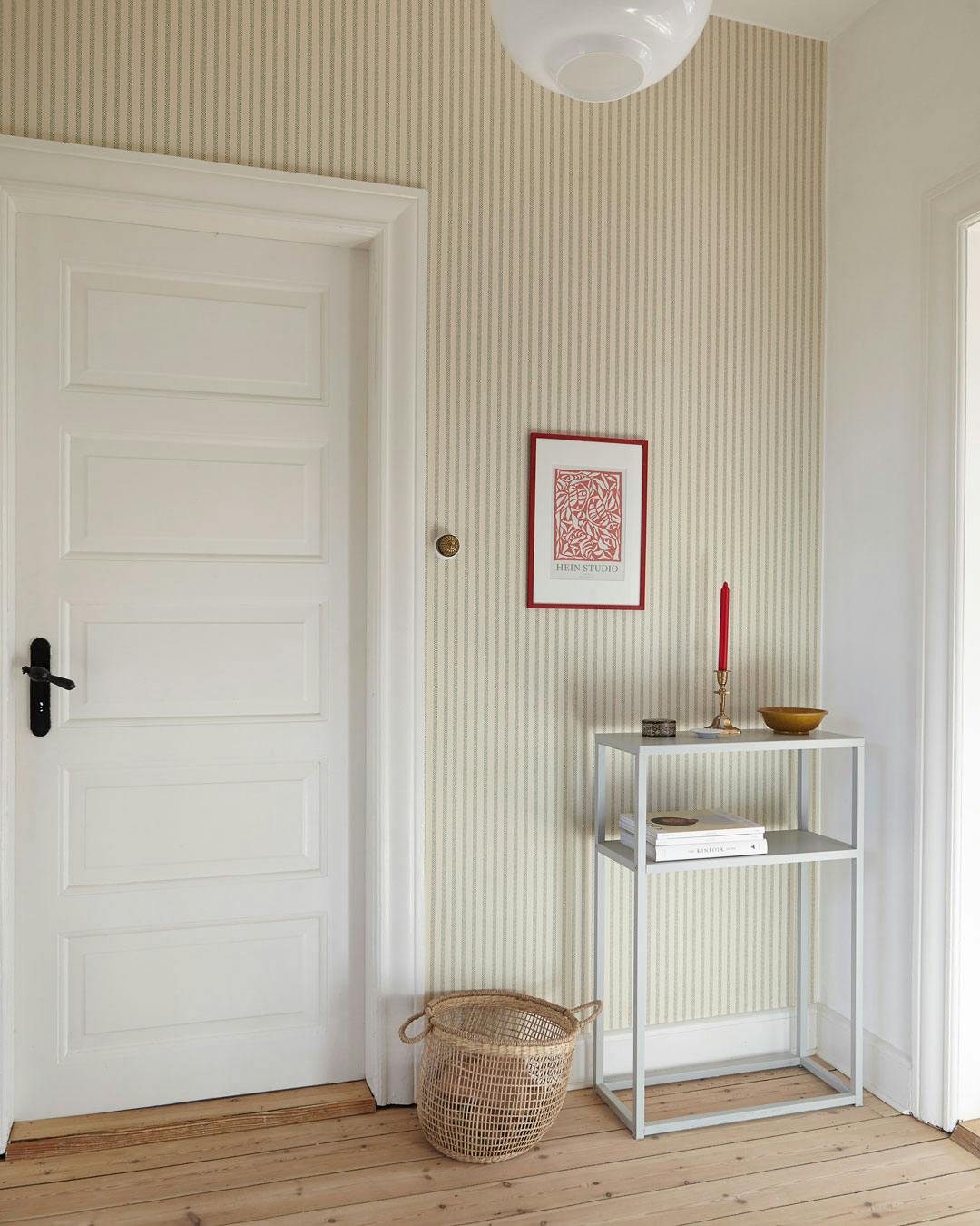 Det stribede er fra Tapet-Cafe og kunsttrykket er fra Stilleben. Reolen i stramt design er fra Søstrene Grene og er blevet opgraderet med metalmalingen Light Blue fra Farrow & Ball.