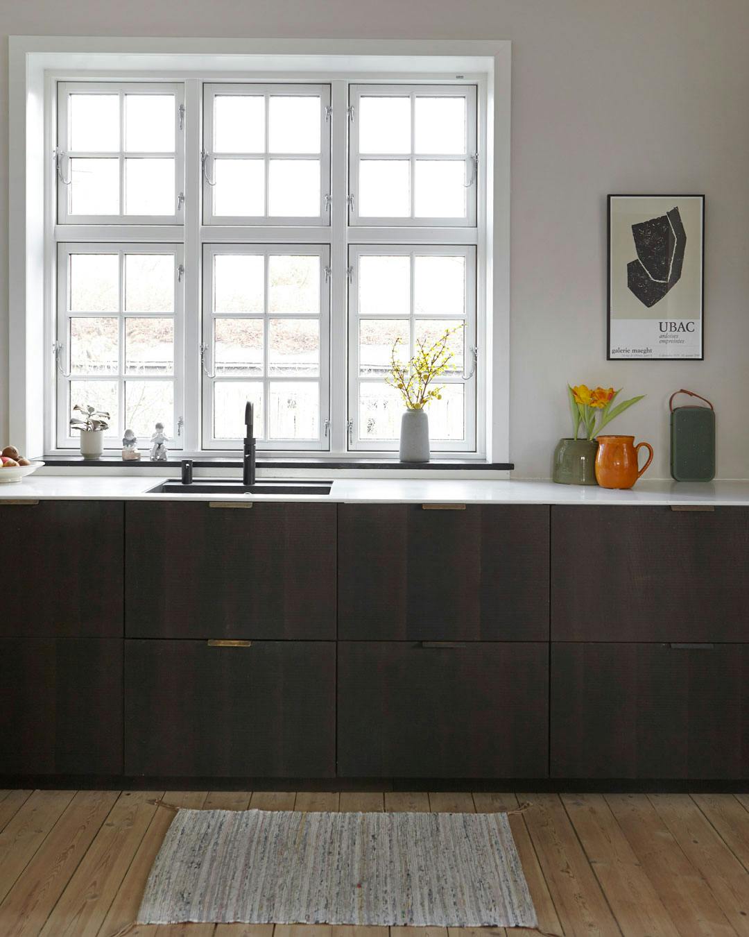 Køkkenet i røget eg giver kontrast til husets gamle detaljer både i stil og farve. Da Caroline Ryttersgaard så det første gang, var hun solgt og valgte det til sit nye hjem, selv om hun ikke vidste, hvor familien skulle bo. Køkkenet er fra Reform, gulvtæppet fra Ikea og kunsttrykket fra Galerie Maeght.
