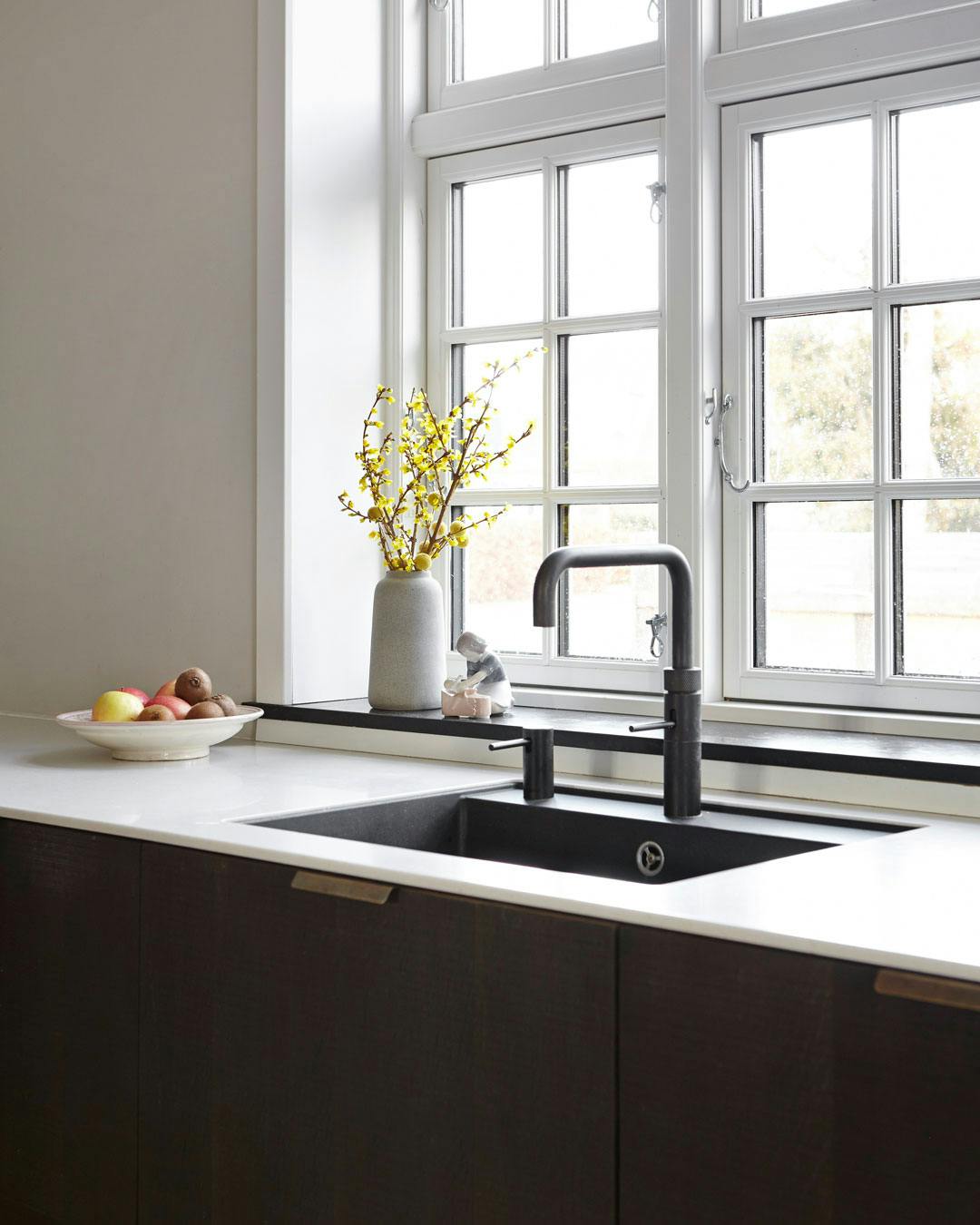 En lille porcelænsfigur fra Bing & Grøndahl i vindueskarmen giver kontrast til det nye køkken fra Reform. Armatur fra Quooker og skål fra Mallorca.