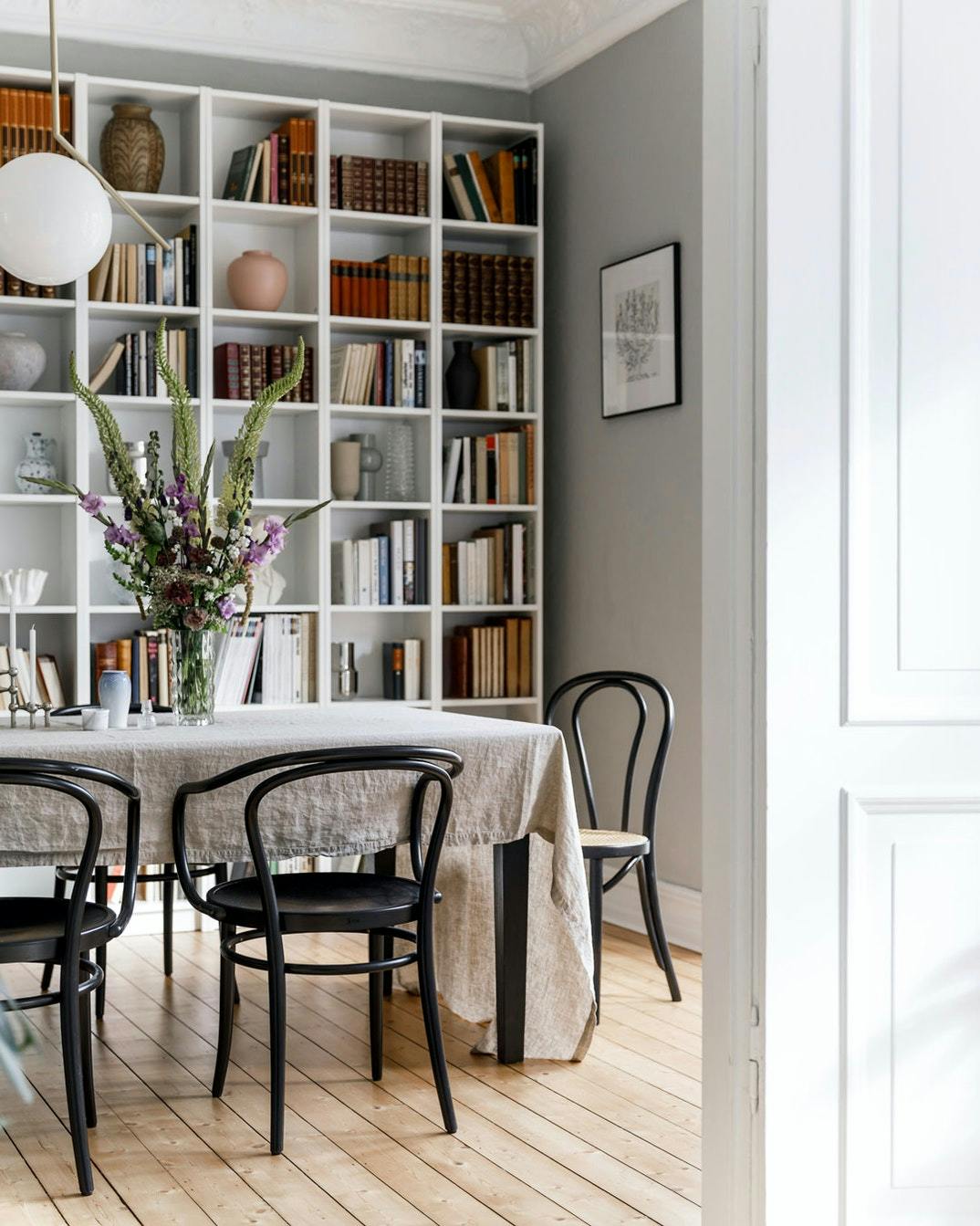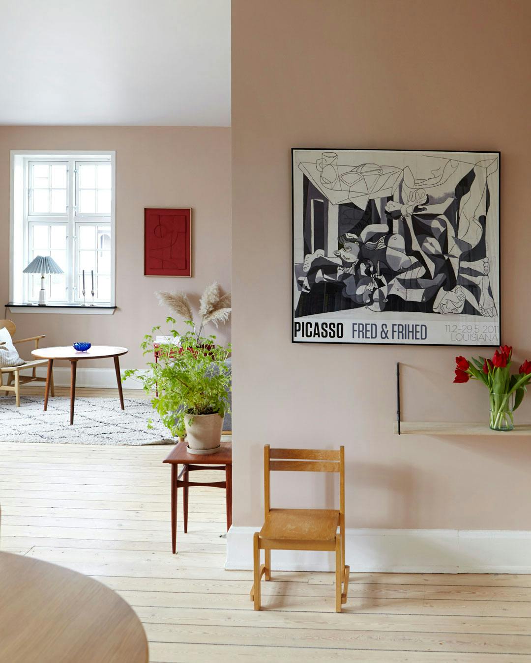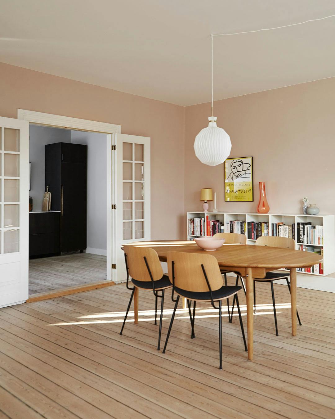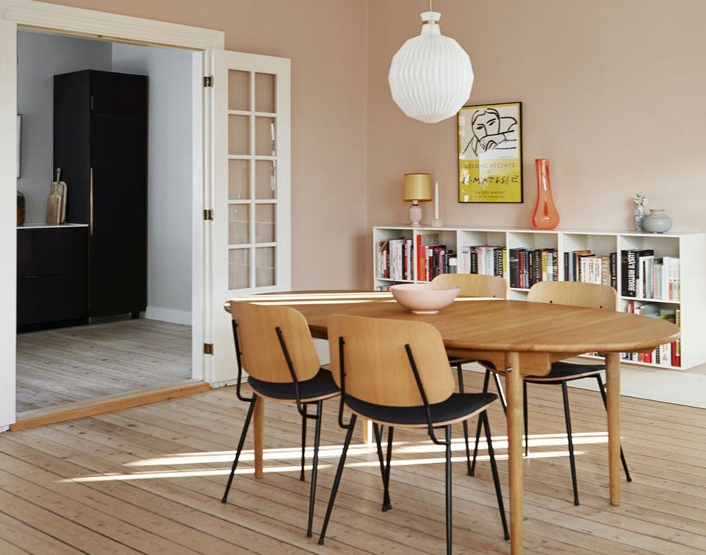 Gør et rum varmt i udtrykket ved at male med rosa nuancer og indrette med møbler af træ. Spisebordet er fra Carl Hansen & Søn, og stolene er fra Fredericia Furniture. Lampen er fra Le Klint. Reolerne er fra Trævarefabrikernes Udsalg, den lyserøde lampe er vintage, glasvasen er fra Kodanska og Matisse-plakaten fra Stilleben.