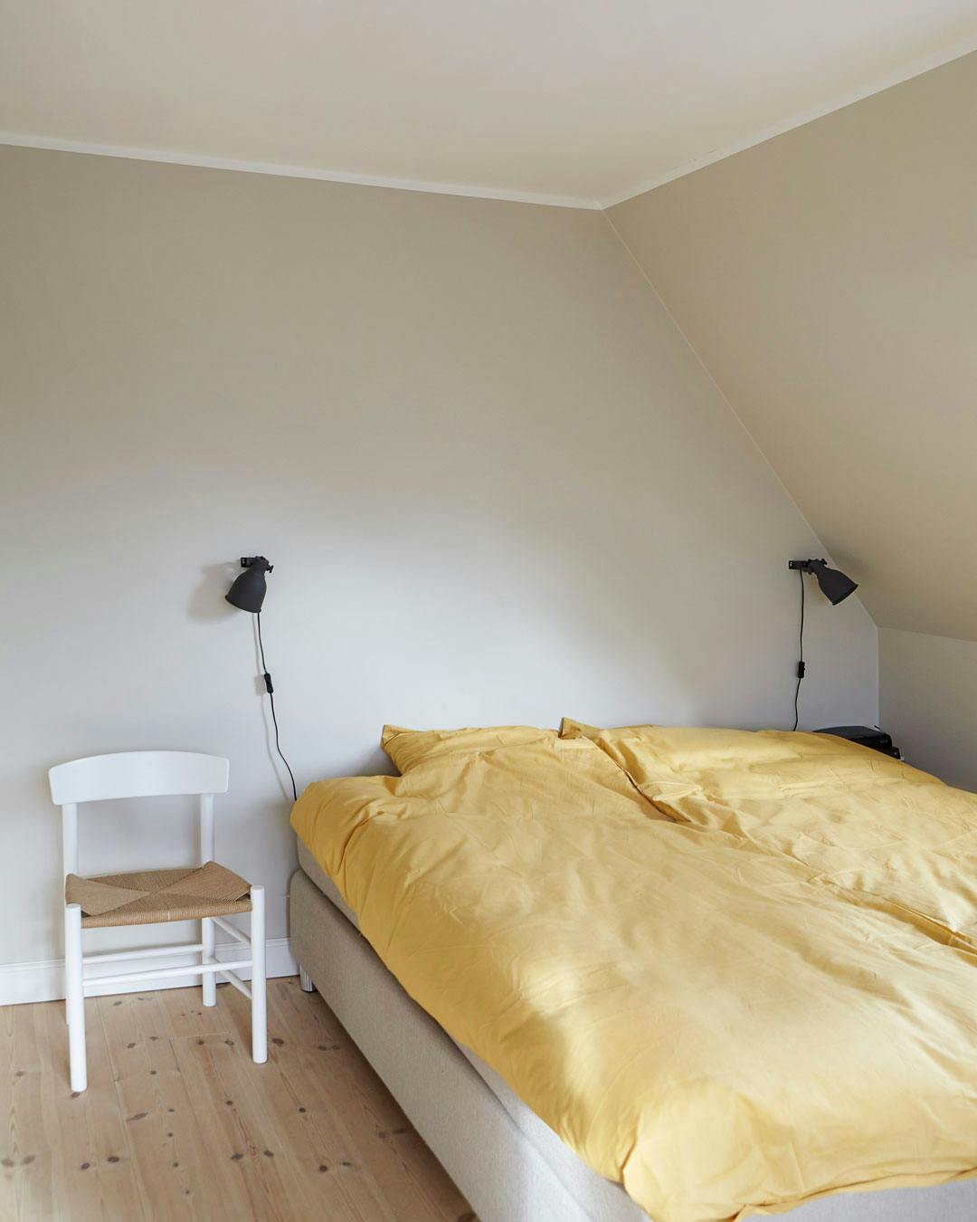 Lyse toner af beige og gul giver soveværelset en varm og rolig atmosfære. Stolen er fra Fredericia Furniture, væglampen fra Ikea og sengesættet fra Ellos.