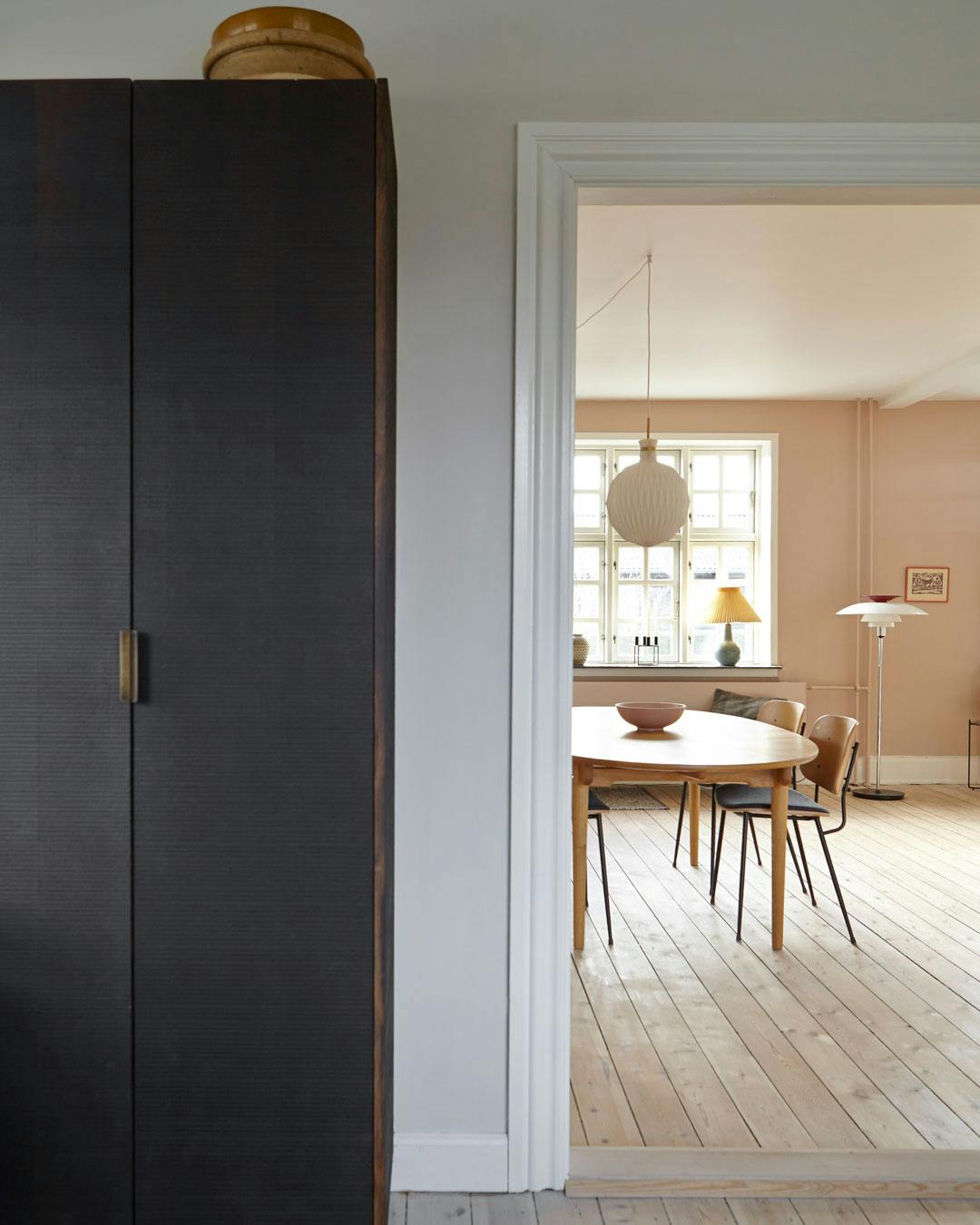 Et kig fra køkkenet ind mod spisestuen, hvis rosa vægfarve står smukt til køkkenets farve Skimming Stone fra Farrow & Ball. Højskabet gemmer på familiens service.