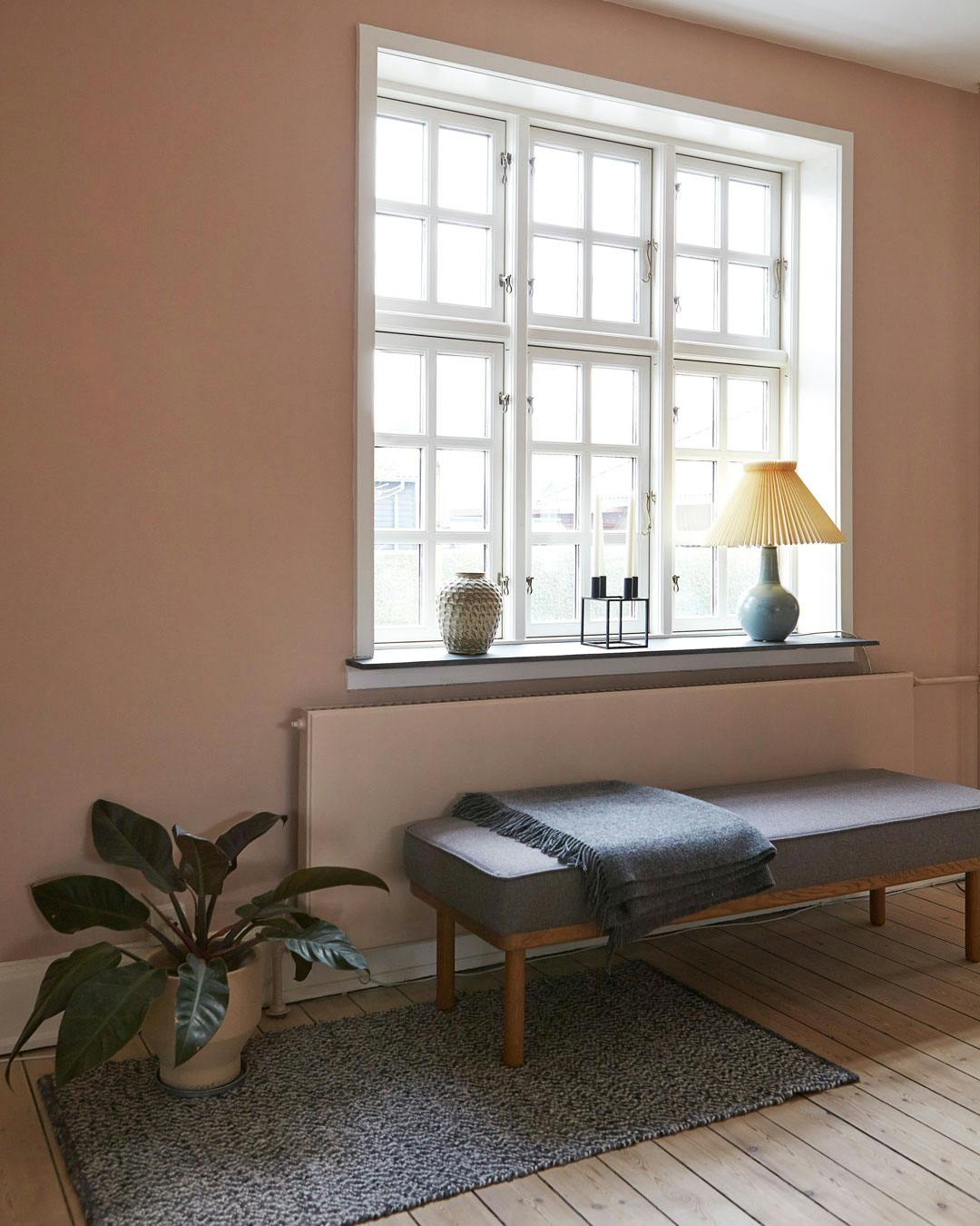 Mal radiatoren i samme farve som væggen, så bliver den mindre synlig. Farven hedder Setting Plaster fra Farrow & Ball. Daybed fra Sofacompany og plaid fra Silkeborg Uldspinderi. Keramiklampen er vintage, mens skærmen er fra Le Klint. Kubus-stagen er fra By Lassen, og vasen er fra et besøg på Clay Museum. På gulvet en krukke fra Skagerak og et gulvtæppe fra Ikea.
