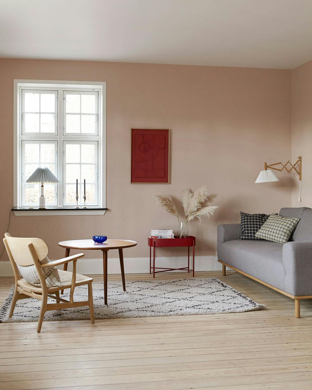 Brug røde detaljer til at pifte en douce indretning op – det giver friskhed til rummet, som her i stuen, der er indrettet funktionelt med tidløse møbler. Væggene er malet med farven Setting Plaster fra Farrow & Ball. Sofa fra Sofacompany, Wegner-stol fra Carl Hansen & Søn og sidebord fra Søstrene Grene. Sofabord og gulvtæppe er købt på auktion. Heiberg-lampen i vinduet er vintage, mens væglampen er fra Le Klint.