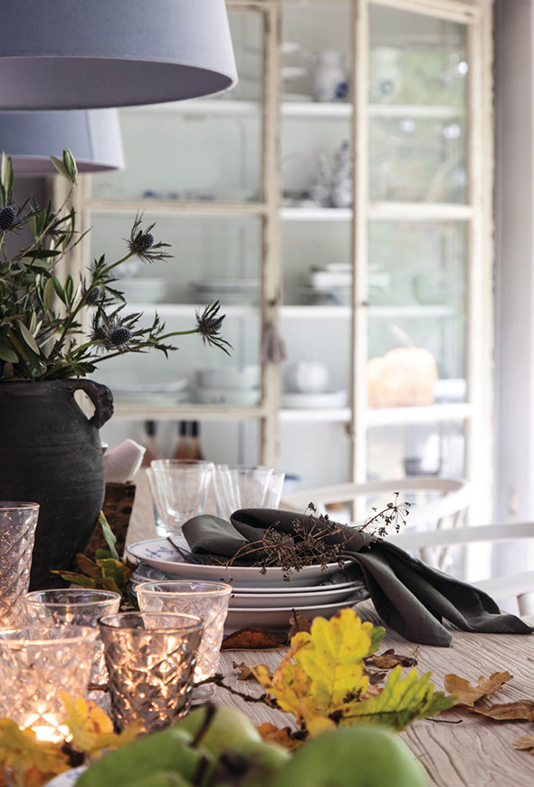 Det nyeste møbel i hjemmet er et stort rustikt langbord, som er bygget af gamle porte og fundet hos en specialist i herregårdsmøblering. Omkring bordet står klassiske Wegner-stole, og rundtomkring i hjemmet er antikke vitrineskabe fyldt med glas og porcelæn. I dagligstuen står en loungesofa i et moderne design.