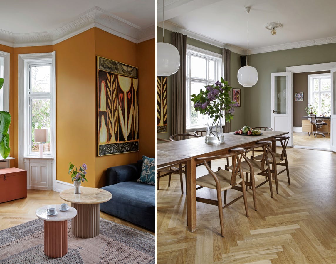 Inspireret af vægfarverne på kunstmuseet Den Hirschsprungske Samling startede parret ud med en mørkeblå, der var flot til kunst, men som virkede for kold og ubeboelig, da den først tørrede op på hjemmets vægge. Dernæst malede de stuen grøn, før de til sidst endte med en varm gul nuance, som Lei “viber ret meget med for tiden”.
