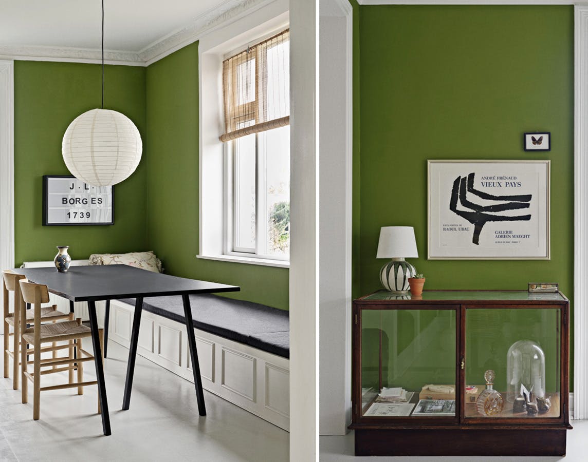 Den grønne farve ved navn Sweet Peas fra File Under Pop har parret valgt til de ellers hvide vægge for at give rummet sin egen, tydelige personlighed. Kurvestol er fundet hos Ruberno Classics, og det lille sidebord er designet af italienske Luca Nichetto for danske &Tradition. Vasen er købt hos Modo Cph, og puderne er fra bl.a. Beau Marche.