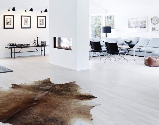Hvordan får man et stort rum med højt til loftet til at indbyde til hygge? Få svaret i denne bolig, hvor det store rum er inddelt i mindre hyggekroge.