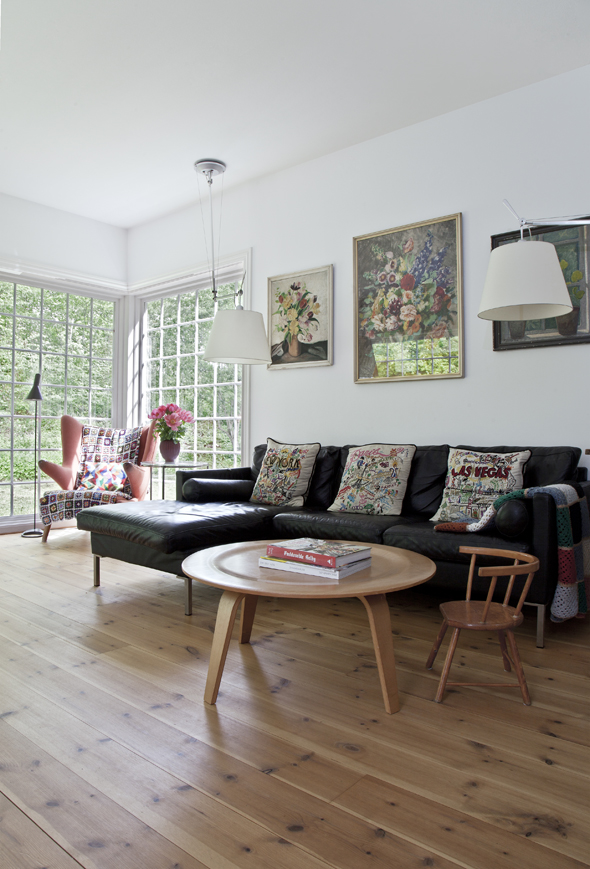 Kristina Lund Pansler er indehaver af en blomsterbutik, og det fornægter sig selvfølgelig ikke i boligindretningen. Det grønne og farverige spiller en stor rolle som interiør og kunst på væggene.