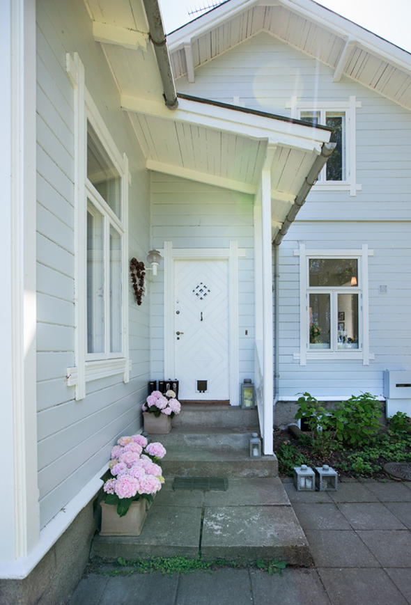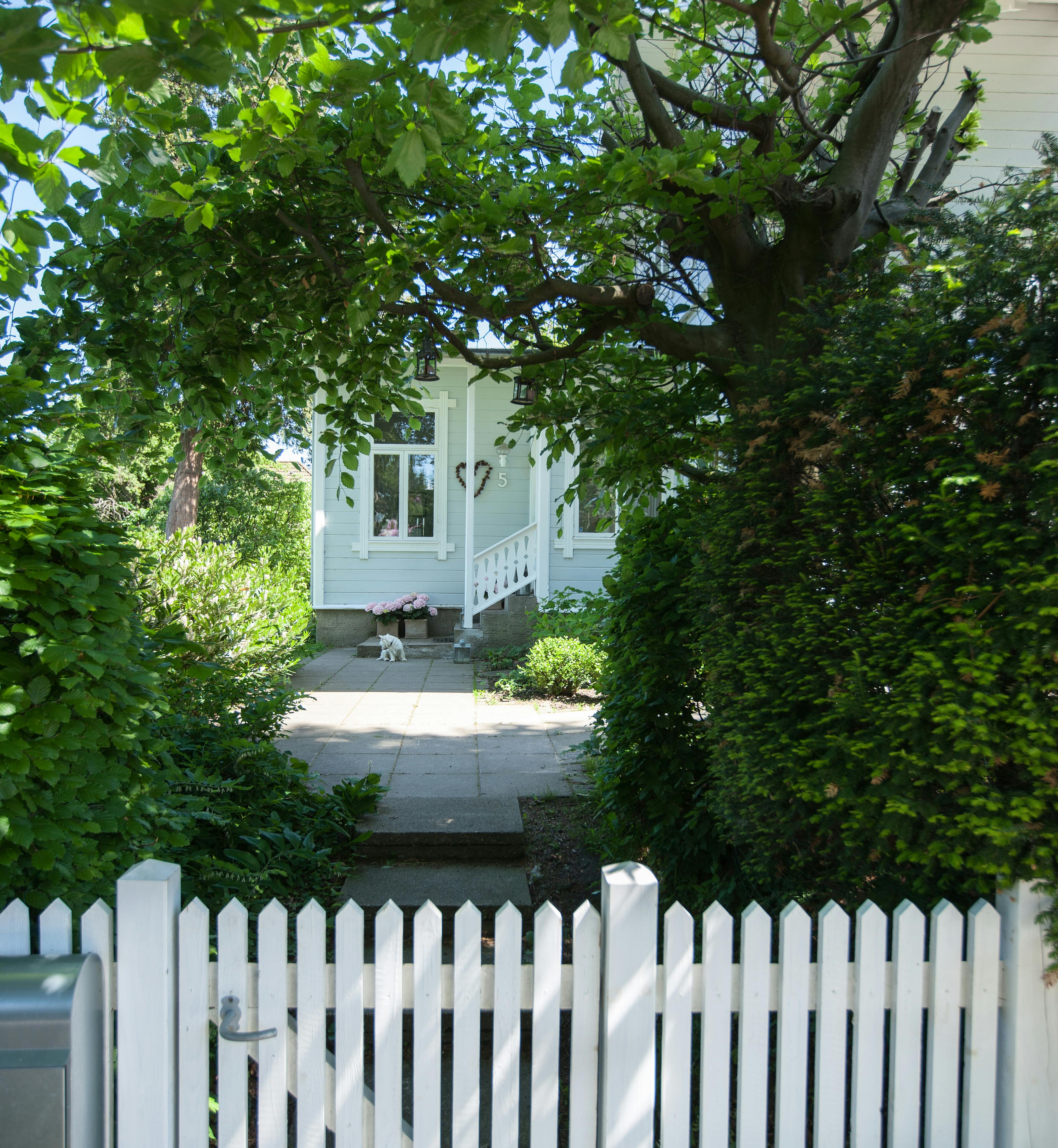 På en villavej nord for København ligger der adskillige træhuse, men familien Hecquets hus skiller sig alligevel ud, fordi det er holdt i lyse farver, og tager man et kig ind over det fine hvidmalede stakit fra fortovet, er man da heller ikke i tvivl om, hvilken stil huset er præget af. Allerede udefra er den feminine tone stået an så fint.
