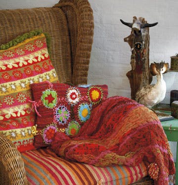 Husets ejer er lige så sprudlende som sine blomster. Hun ligner en eksotisk sommerfugl med sit røde hår og de løse og lette gevandter, der lyser i alle regnbuens farver. Og indretningen i det lille bondehus er lige så eksotisk som sin ejer. Vægge og lofter er hvidmalede, gulvene er af lyst træ og møblerne af flet. Det hele er lyst, luftigt og let, og overalt stråler puder, plaider, gulvtæpper og nips i stærke og varme farver og fylder det gamle nyrenoverede hus med liv og glæde.