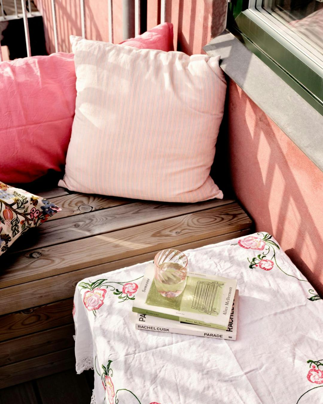 Parret har bygget en bænk med låg til altanen. Den rummer urtepotter, jord og andet plantegrej. Den broderede dug er et genbrugsfund, og den lyse pude er fra Studio Feder.