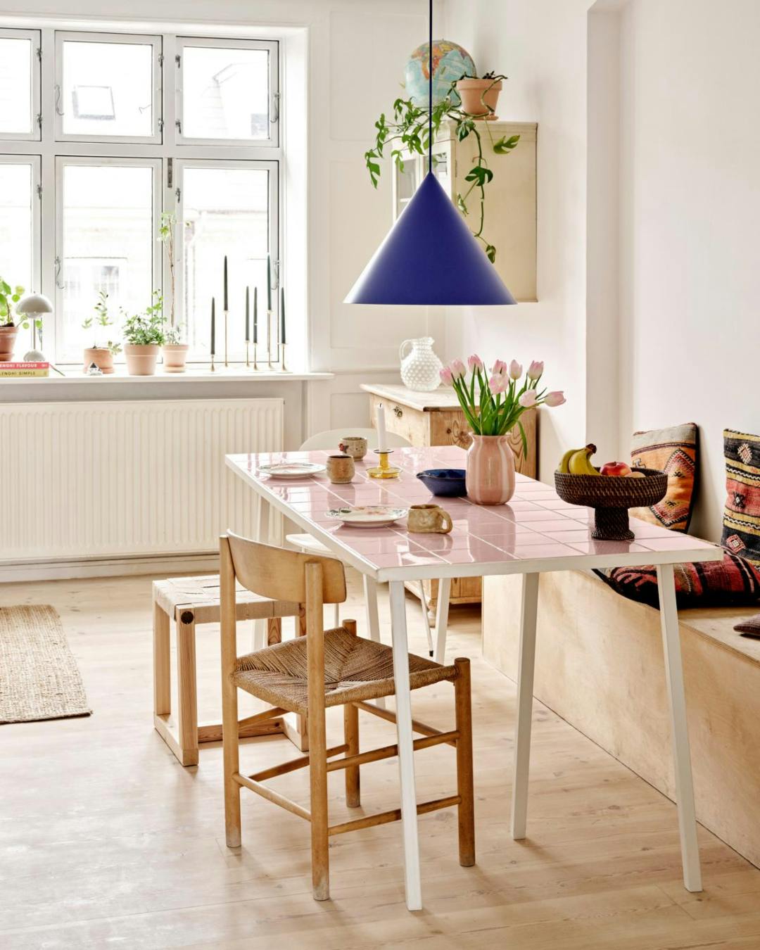 Caroline har selv lavet flisebordpladen på bordet i køkkenalrummet, og sammen med sin far har hun bygget slagbænken, der bl.a. rummer vasketøjskurve. Myrestolen har hun arvet fra sin mormor. Folkestolen købte hun brugt, for patina og brugsspor er kun et plus, mener hun. Puderne har hendes forældre taget med hjem fra Tyrkiet.