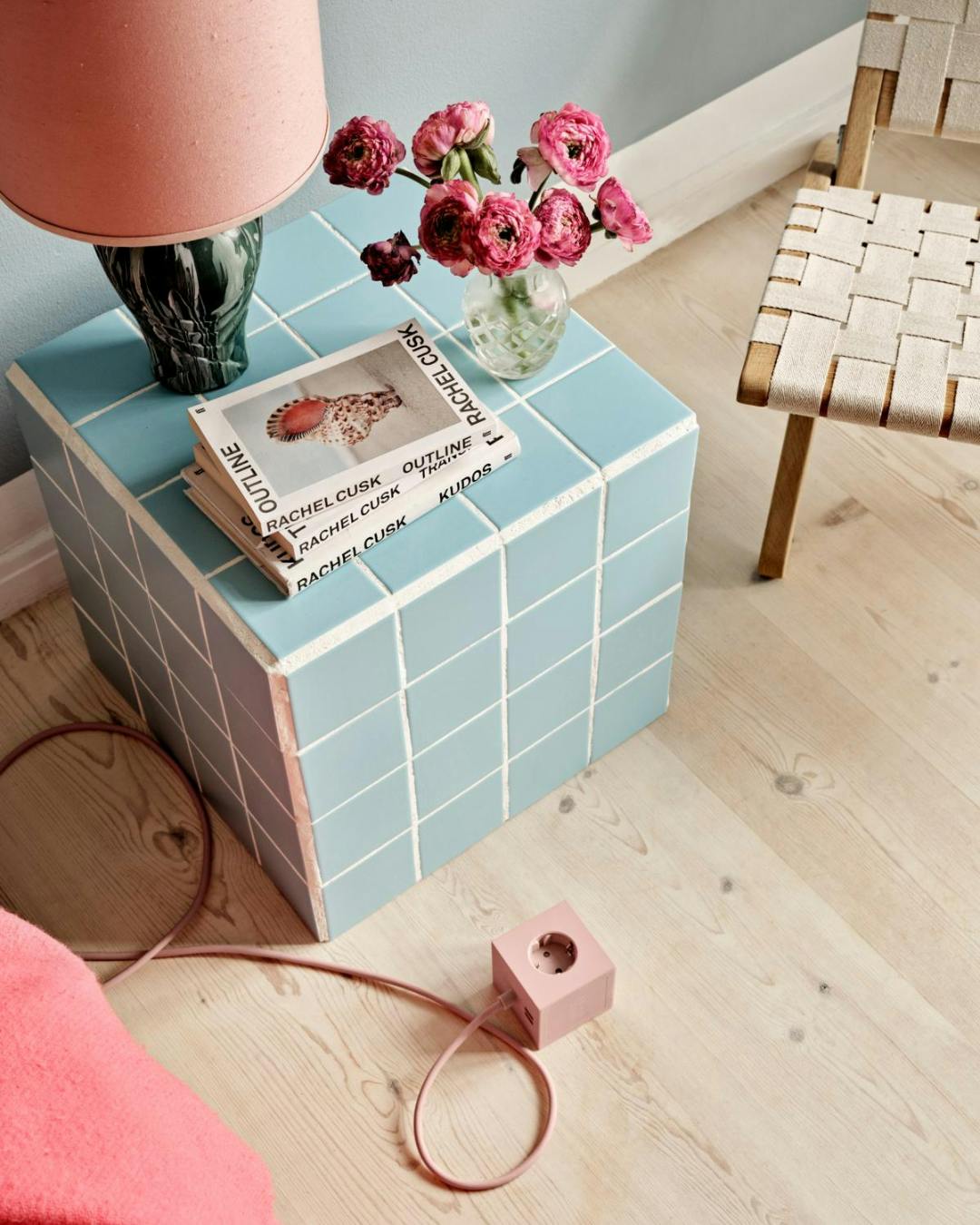 Caroline fik hjælp fra sin far til at bygge flisekuben, der er lavet af vandfaste plader, så den også kan stå udenfor. De blå fliser er fra Bad og Fliser. Bordlampen er genbrug, som Carolines veninde har dekoreret med marmoreffekt. Den blå vægfarve hedder Dusty Blue og er fra Jotun. Sammenklappelig stol fra Carl Hansen & Søn og maleri af Richard Sänger.