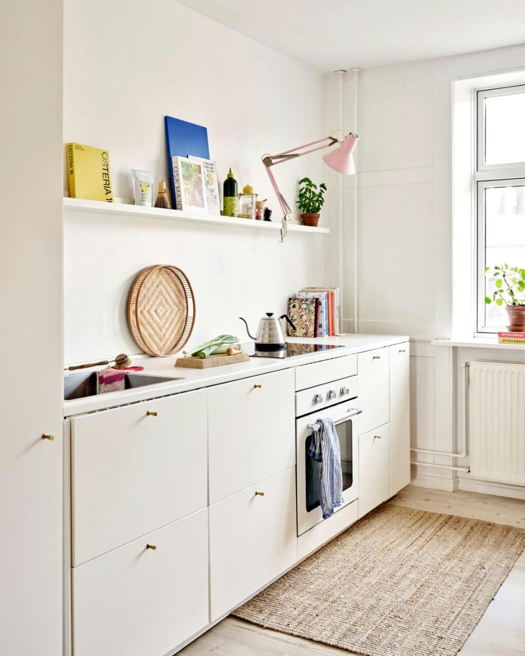 Da Caroline flyttede ind, udskiftede hun bordplade og vask i køkkenet. Først efter et par år, da det virkelig hang i hængslerne, skiftede hun resten af køkkenet ud med billige moduler, så hun kunne holde budgettet på lidt over 10.000 kr. Modulerne er fra Ikea, og bordpladen er fra Silvan. Den lyserøde arkitektlampe fandt Caroline brugt.
