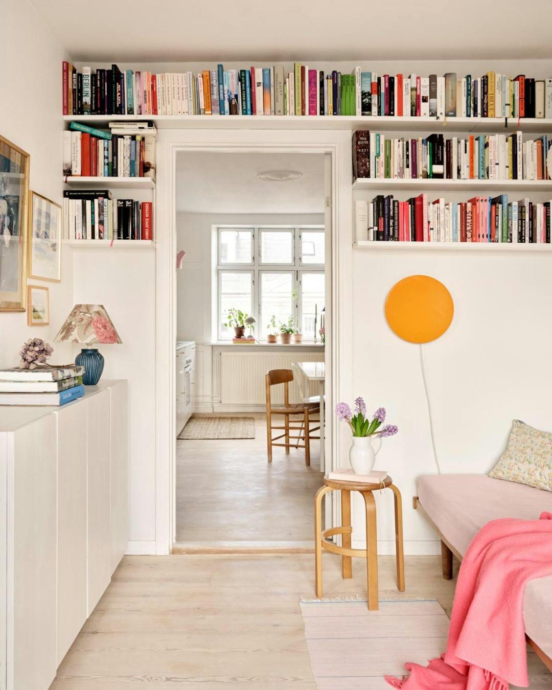 Den orange væglampe, der minder lidt om en solnedgang, når den er tændt, har Caroline og kæresten lavet. Hylderne rummer en del klassikere. De er hængt op over og rundt om døren for at udnytte loftshøjden.