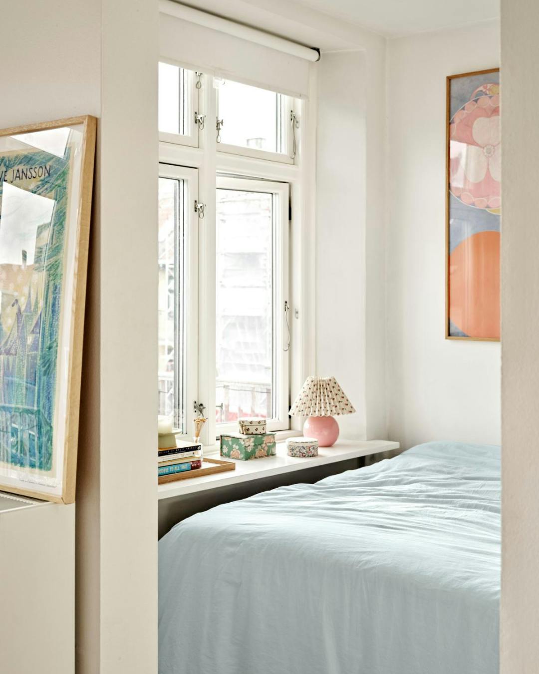 Carolines far hjalp med at bygge fundamentet til sengen af lægter, som er skruet fast i væggen, og et par Ikea-kommoder yderst til opbevaring. Bordlampen er en genbrugsgave fra en veninde, og den store smykkeæske er også fundet brugt. De runde æsker er fra Sezane.