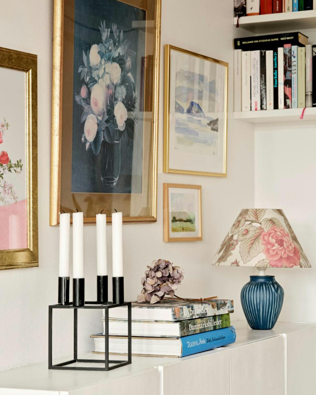 Akvarelmalerierne har Carolines grandtante og en ven til hendes farfar malet. Blomstermaleri er fra en butik på Fejø. Bordlampen er genbrug.