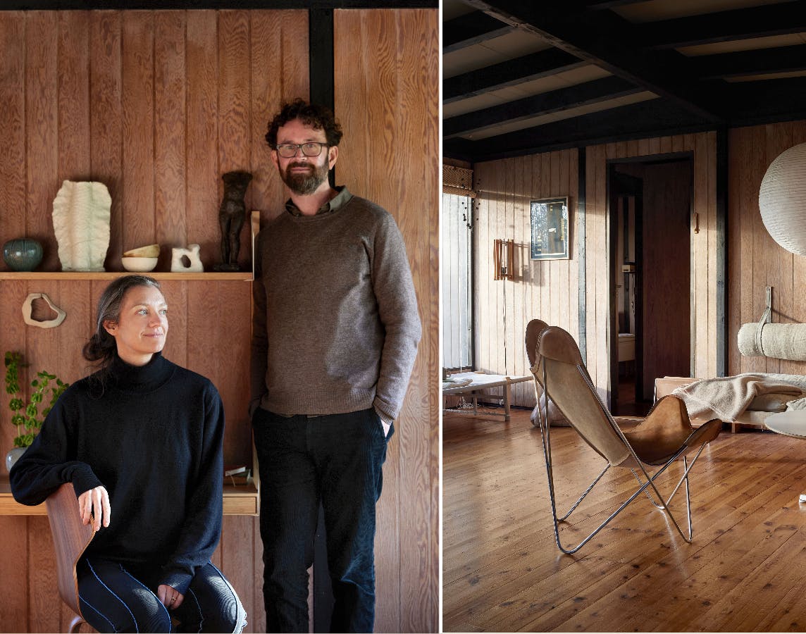 Enkle linjer og rolige nuancer sætter rammen for stilen i sommerhuset, hvor ubehandlet træ får lov at træde i karakter. Sofaen er tegnet af Tage Poulsen, den brune lerskulptur på sofabordet er skabt af multikunstner Walther Linis.