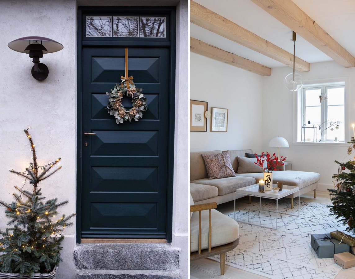 Byd gæsterne velkommen med grantræ og julelys, hvis du som Gabriella har en rummelig entré. Hun og sønnen Vincent henter selv juletræet og sætter det ind i starten af december. På det hænger både arvet og hjemmelavet papirklip samt pynt fra Walther & Co., Broste Copenhagen og House Doctor.