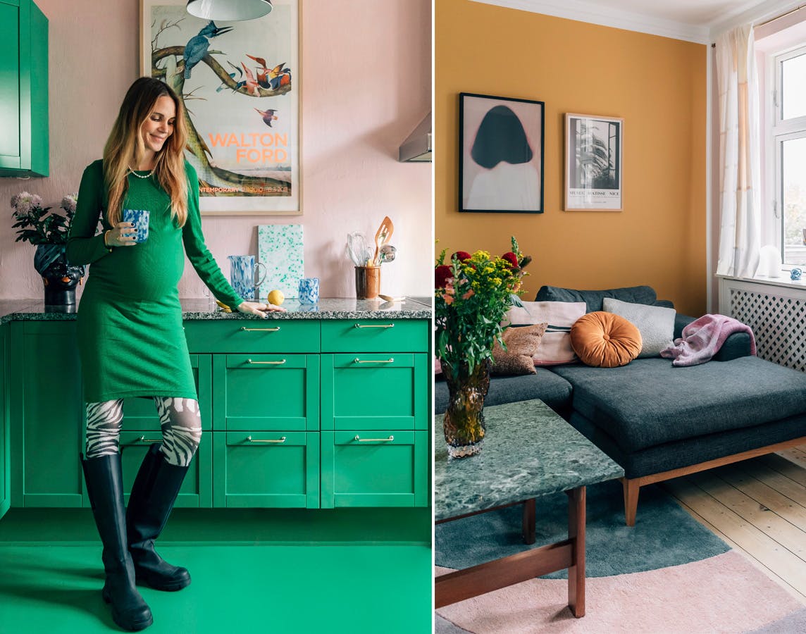 − Køkkenet skal skiftes ud i fremtiden, og vi var begge enige om, at det skulle have en farverig overhaling indtil da. Jeg var selv ude i lyseblå, men Bjørn mente, at det skulle være endnu vildere, nu hvor køkkenet alligevel ikke er her for at blive. Men jeg er vild med kombinationen af stærk grøn og svag rosa og har faktisk ikke længere travlt med at skulle have nyt køkken, siger Mathilde.
