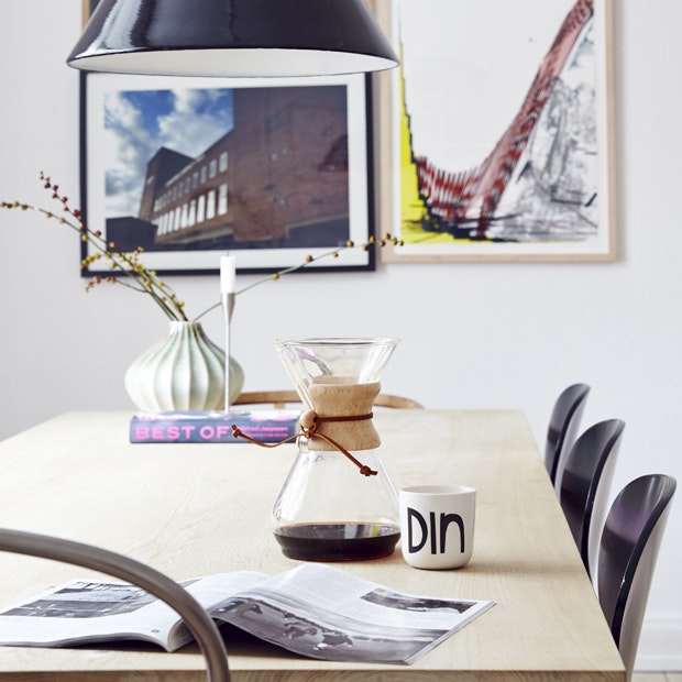 De 185 m2 er gennemførte med fokus på detaljerne. Stilen er stram, men der er også rum til humoristiske og farverige indslag, såsom kæmpe grafiske bogstaver og en stor lyserød lænestol, som Signe Bertelsen har købt for 300 kr. på Lauritz.com. Og så er der masser af kunst.