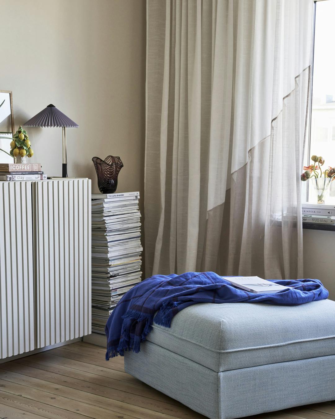 Ved at stable bøger og magasiner får du en personlig piedestal at skabe stilleben. Puffen og skabet er fra Ikea – begge upcyclet, så de passer bedre ind i hjemmet. Lampen er fra Hay, og gardinerne er to gardiner i hvid og beige syet sammen på midten. Den blå plaid er fra &Tradition.