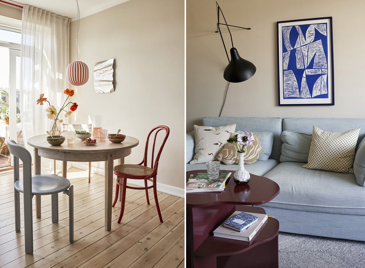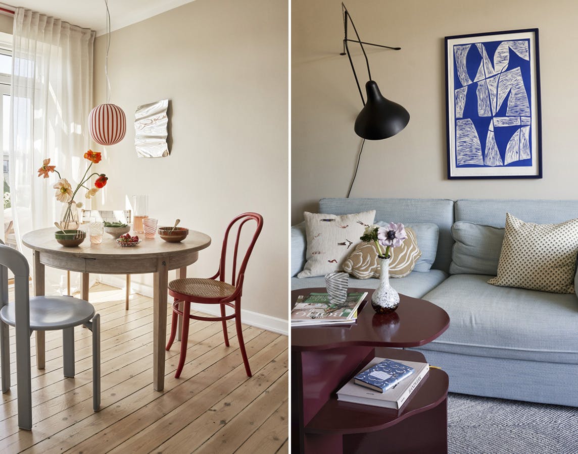 Den røde gardinstang er et DIY-projekt, der sætter prikken over i’et og binder indretningen sammen med stellet på Wienerstolen og striberne på lampen fra Established & Sons. Den blå stol er fra Hay, og vægkunsten er af Caia Leifsdotter.