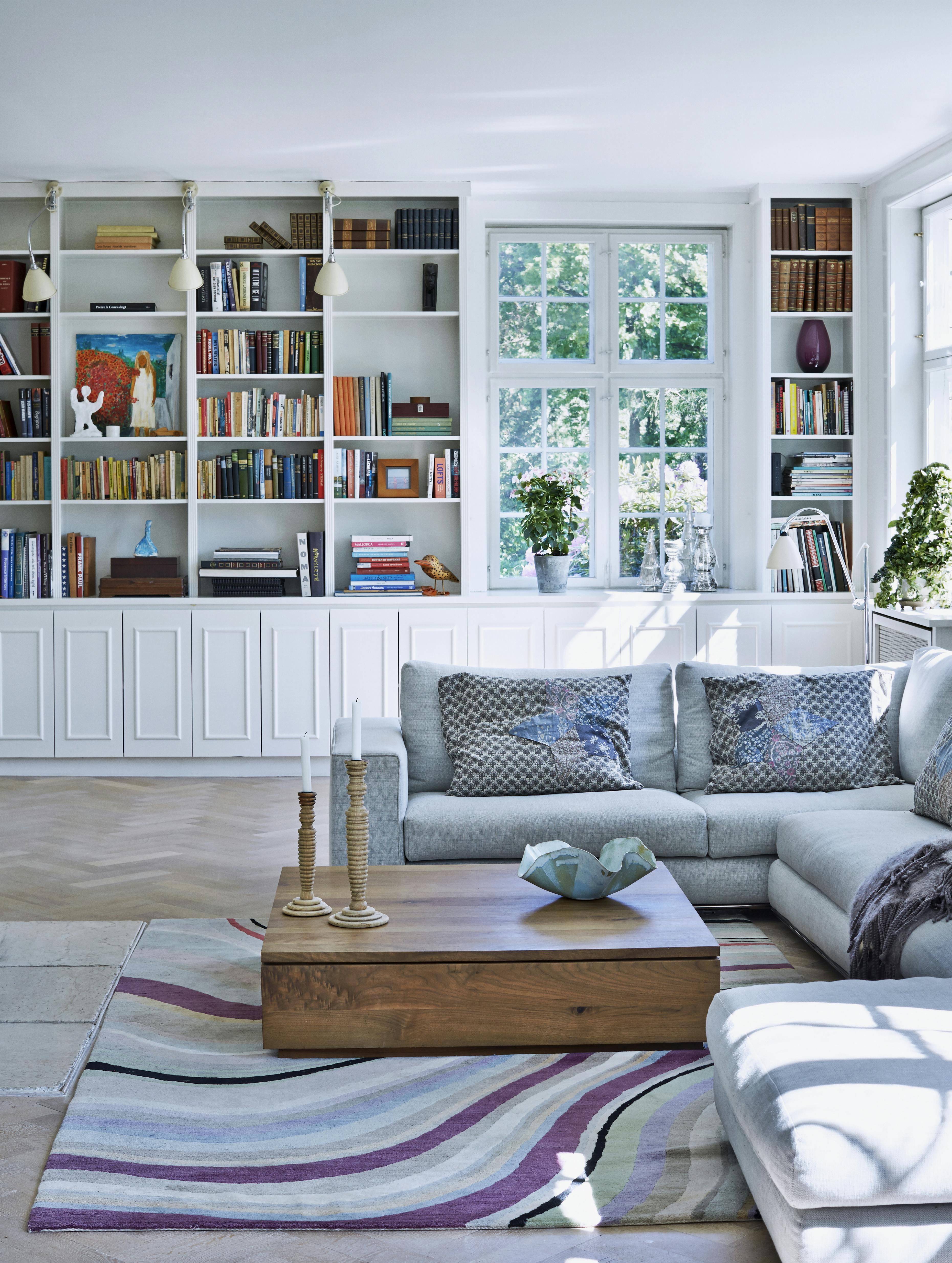 Reolsystemet, der rummer familiens mange bøger, er speciallavet til stuen, mens de brede flydesofaer, der indbyder til hygge, er fra italienske Minotti. Det praktiske sofabord på hjul er tegnet til rummet af Lises mand, mens maleriet er købt på auktion.
