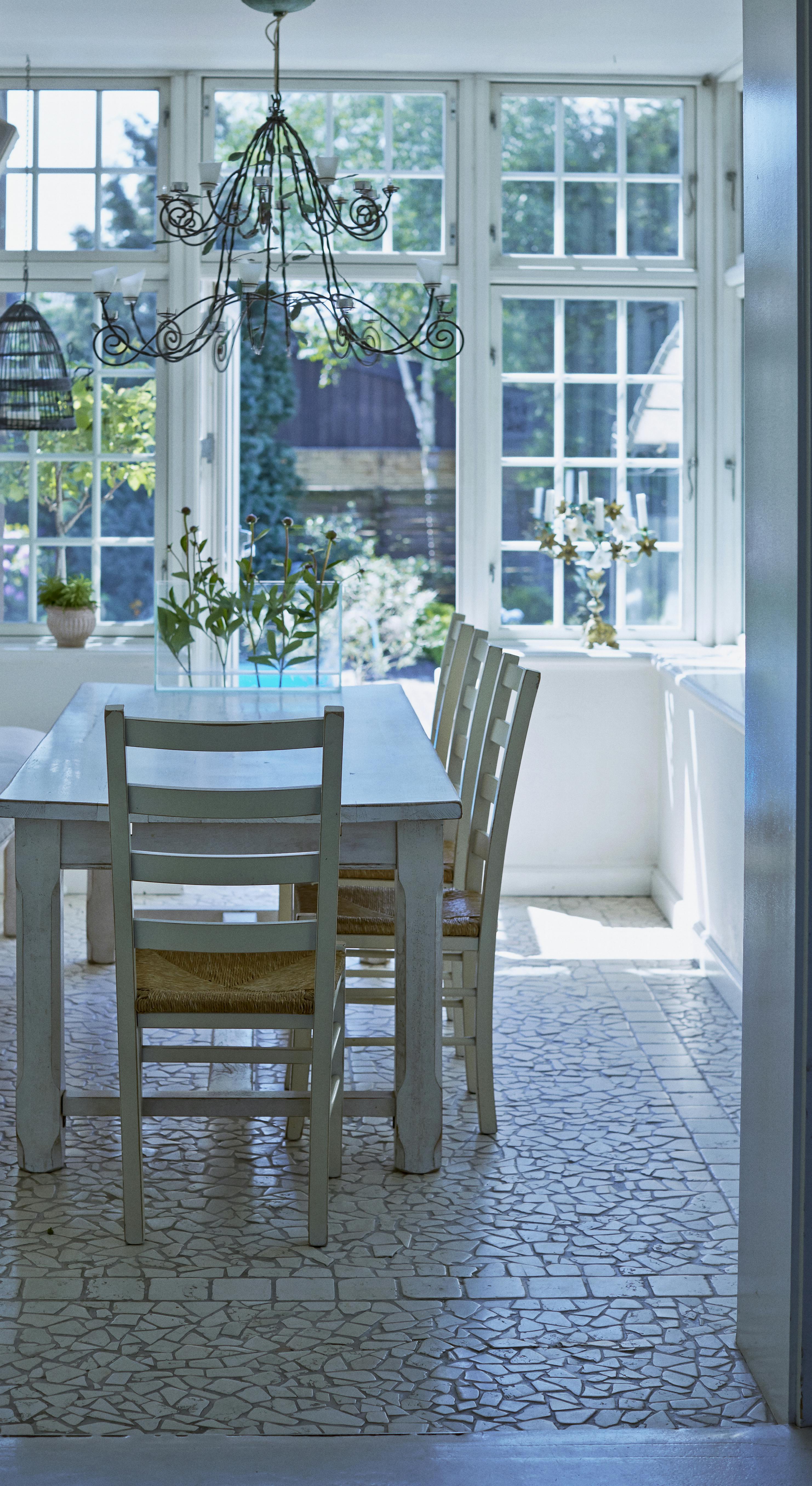 Hvidkalkede vægge og et gulv med en mosaik af bløde strandsten giver stemning som i en villa ved middelhavet i den lille spisestue, der ligger i direkte forlængelse af køkkenet og med udgang til haven. Træbordet er fra Ilva ligesom stolene, mens bænken er bygget særligt til rummet. Lysestagen er en fransk vintage-model fra københavnske Fil de Fer.