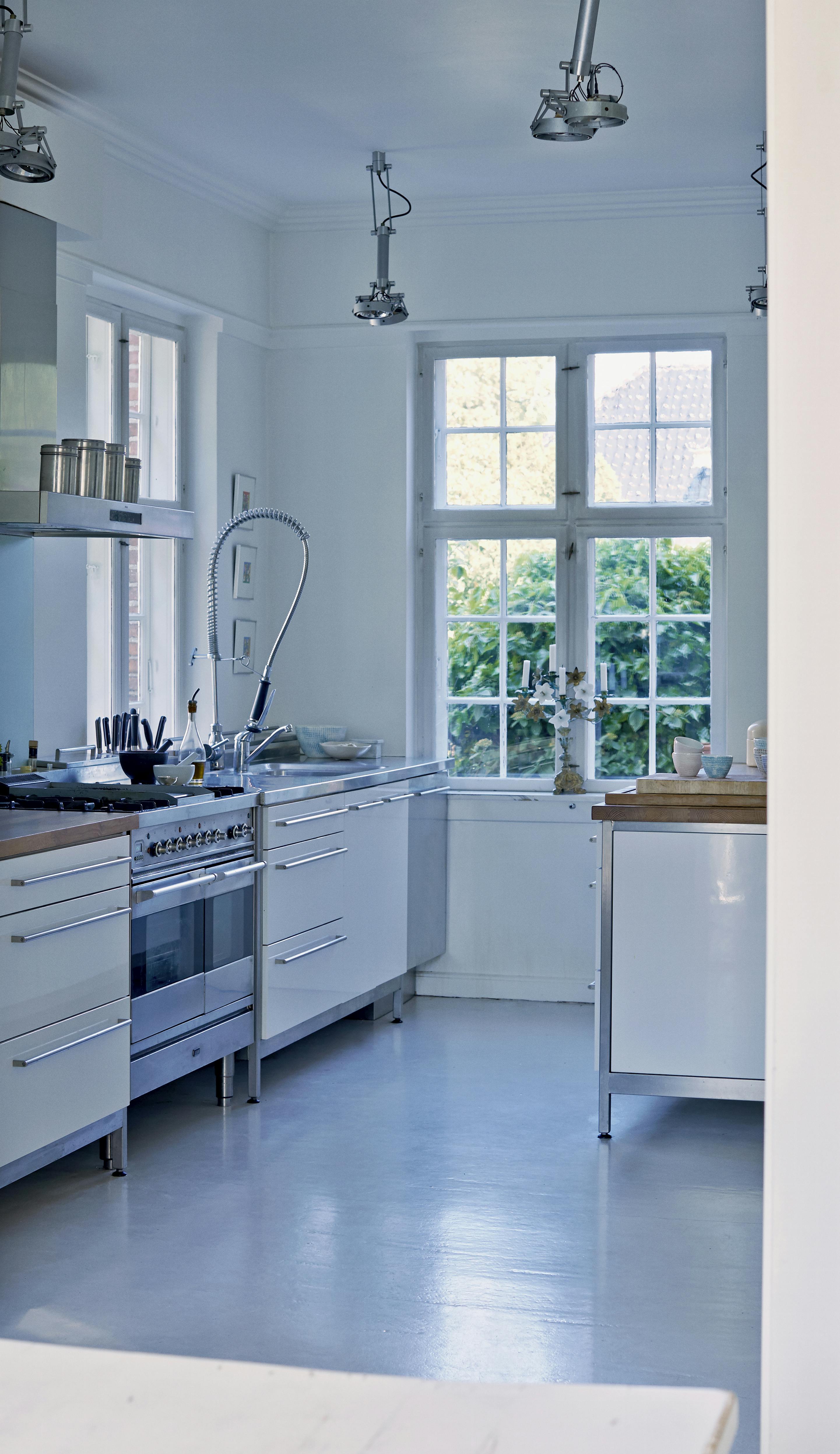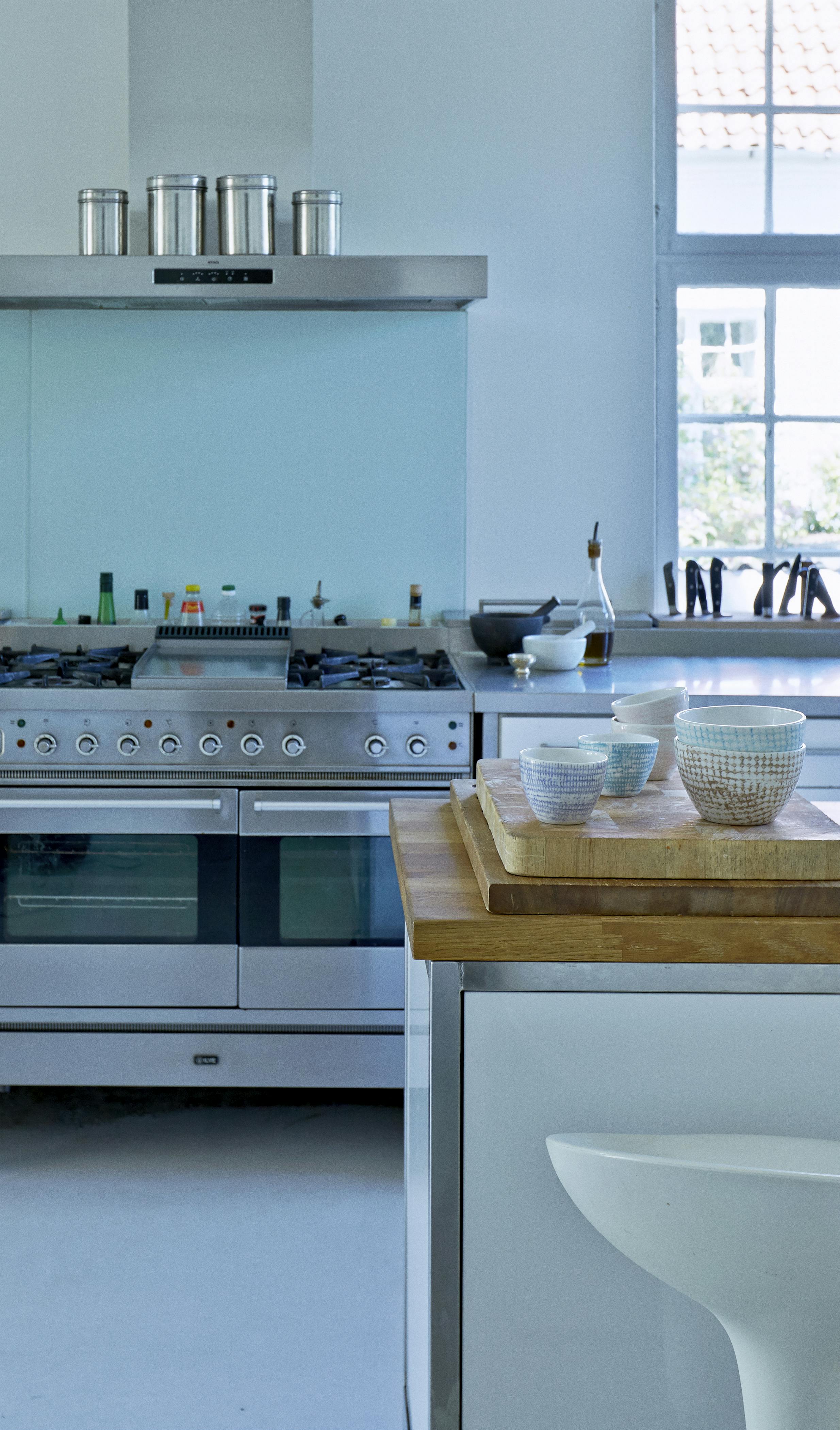 I løbet af parrets 29 år i huset er køkkenet blevet skiftet tre gange, men de aktuelle elementer fra Copenhagen Square Kitchen holder Lise så meget af, at de skal slides helt op, før de bliver erstattet af nye. Det brede kokkekomfur i blankt stål er fra Ilva, mens de mange små skåle med mønster er fra Sukima.