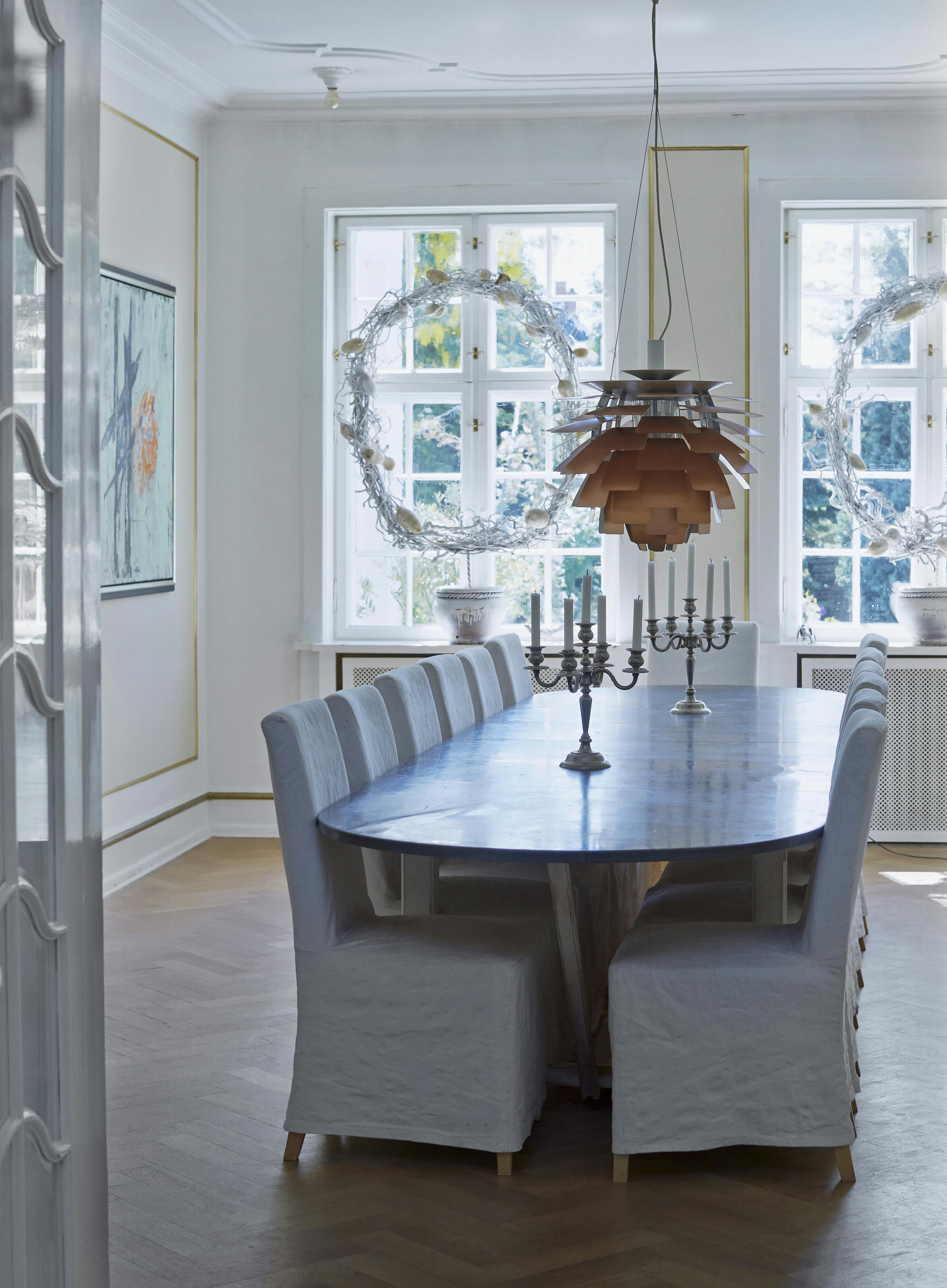 Lises mand Claus lod sig inspirere af en bardisk, da han tegnede spisebordet, som derefter blev bygget til stuen af en lokal snedkermester. Omkring det står en række stofbeklædte stole købt i Ilva, og over bordet hænger Piet Heins klassiske Koglen-lampe, som er et arvestykke. Maleriet er af tv-værten Jarl Friis-Mikkelsen.
