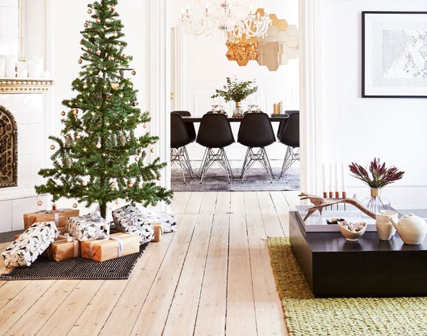 De går efter at bruge det, der allerede findes i deres 225 m² store herskabslejlighed, og så spice det lidt op med eksempelvis stjerner, nødder og stearinlys.