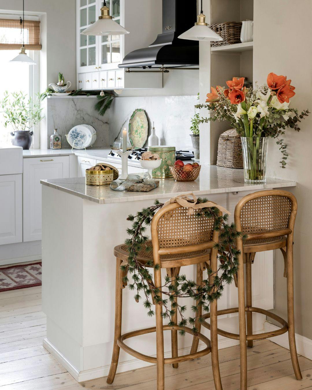 Rundtomkring ligger snydepakker til pynt, og i stort set hvert et rum står enten amaryllis, hyacinter eller franske anemoner. Morin elsker også at lave små, anderledes dekorationer.