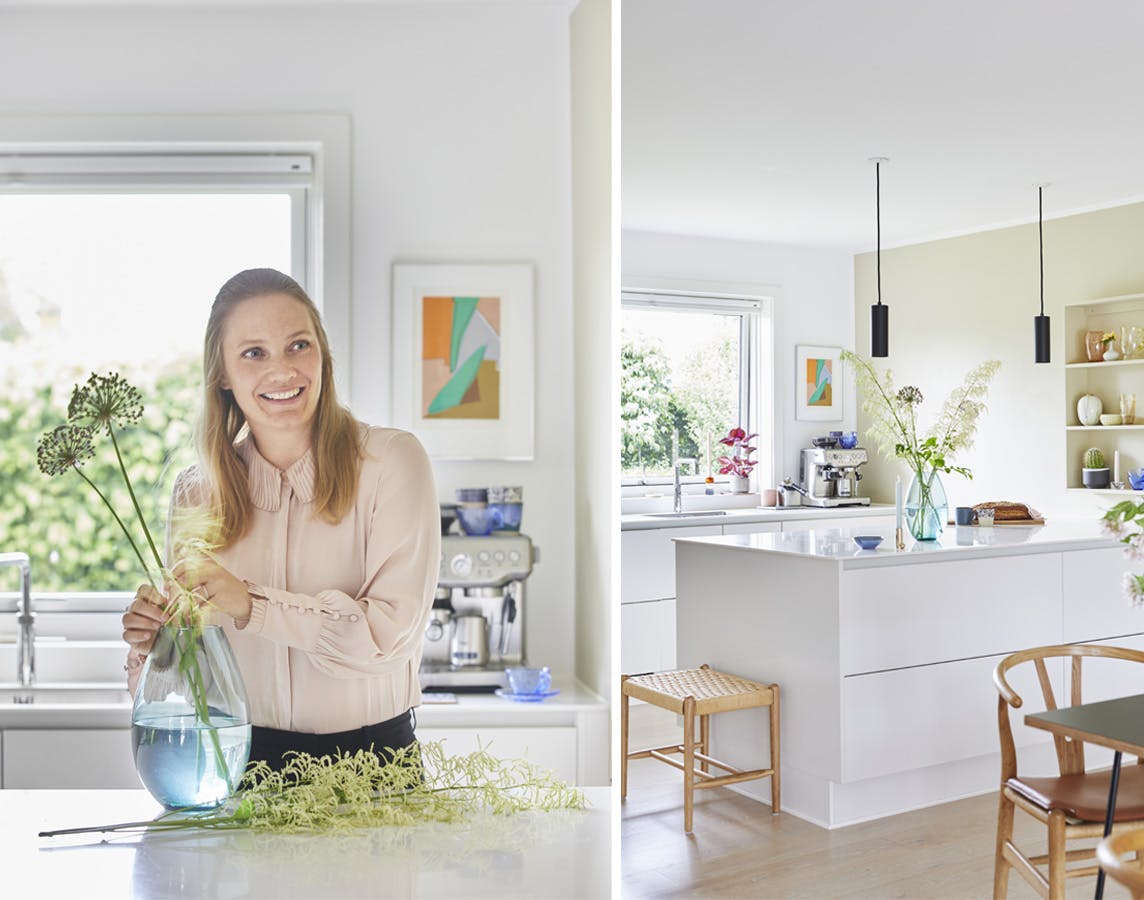 Da parret lavede nyt køkken, blev en af de bedste beslutninger den ekstra brede køkkenø fra HTH. Her er der plads til både madlavning, lektielæsning og en kæmpe buffet, når der er gæster. Køkkenalrummet er Signes yndlingsrum om sommeren, fordi der altid er lyst og god plads til, at hele familien kan hygge sig med forskellige projekter.