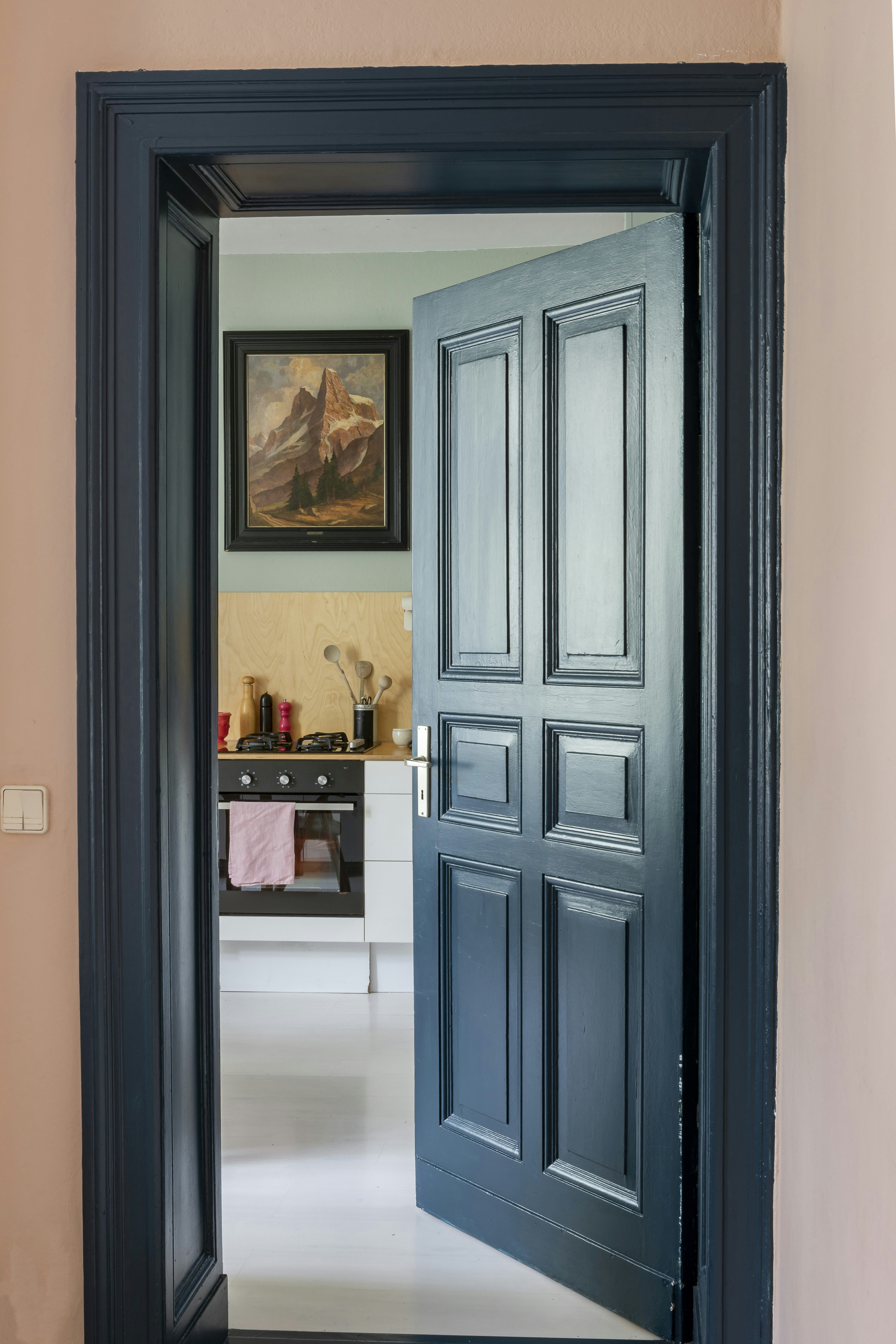 Mal stuk og fyldningsdøre i en usædvanlig farve, der giver et legende modspil til en klassisk herskabelig stil.