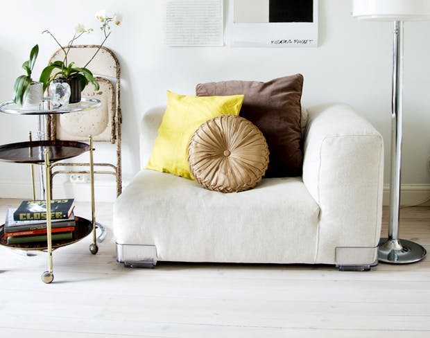 Det er også rigtig vigtigt, at du starter med at rense ud i alle dine idéer om, hvad et hjem SKAL indeholde. Tag i stedet udgangspunkt i dig selv og dine behov. Det kan for eksempel være, at du slet ikke har brug for et spisebord, fordi du alligevel spiser i køkkenet. Så er der jo ingen grund til at bruge gulvplads på det. I boliggalleriet herunder kan du se en smuk studiebolig på 40 m2, hvor indehaveren netop har truffet nogle bevidste valg. For eksempel har hun ingen sofa i stuen, men i stedet for en stor lænestol, som til fulde opfylder hendes behov.