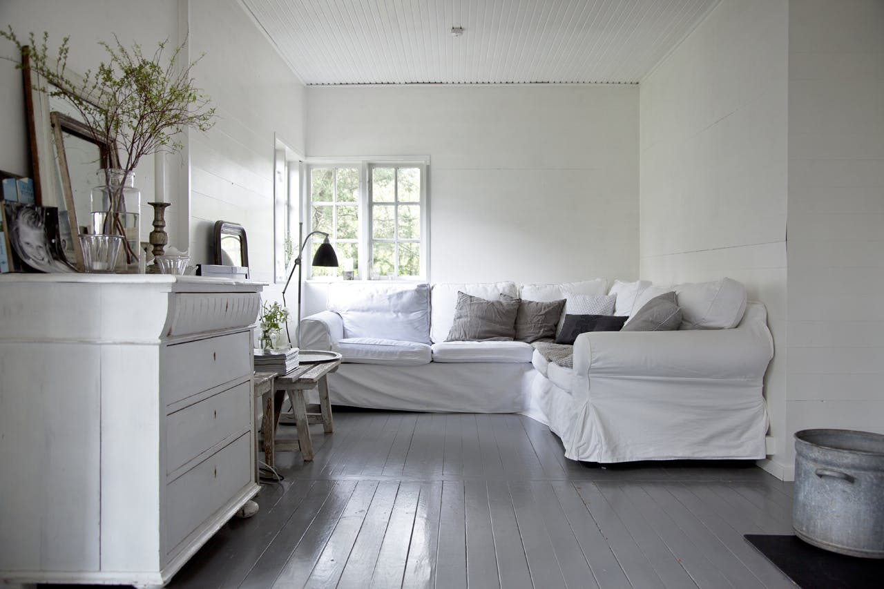 Dette sommerhus havde nuancer af brunt både ude og inde, dengang familierne købte sommerhuset. Det blev hurtigt besluttet at give huset et mere nordisk præg, og huset blev derfor malet sort med hvide vinduer og døre - det typiske sommerhuslook på Sjællands nordkyst. Indendørs blev vægge og lofter malet kridhvide og gulvene grå for at skabe en lys og luftig baggrund for den enkle og nordiske indretningsstil.