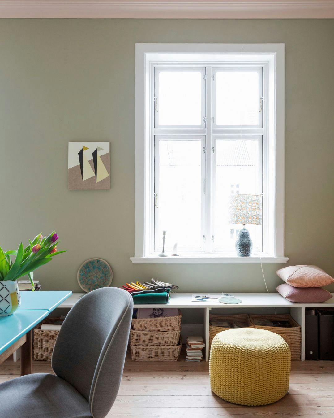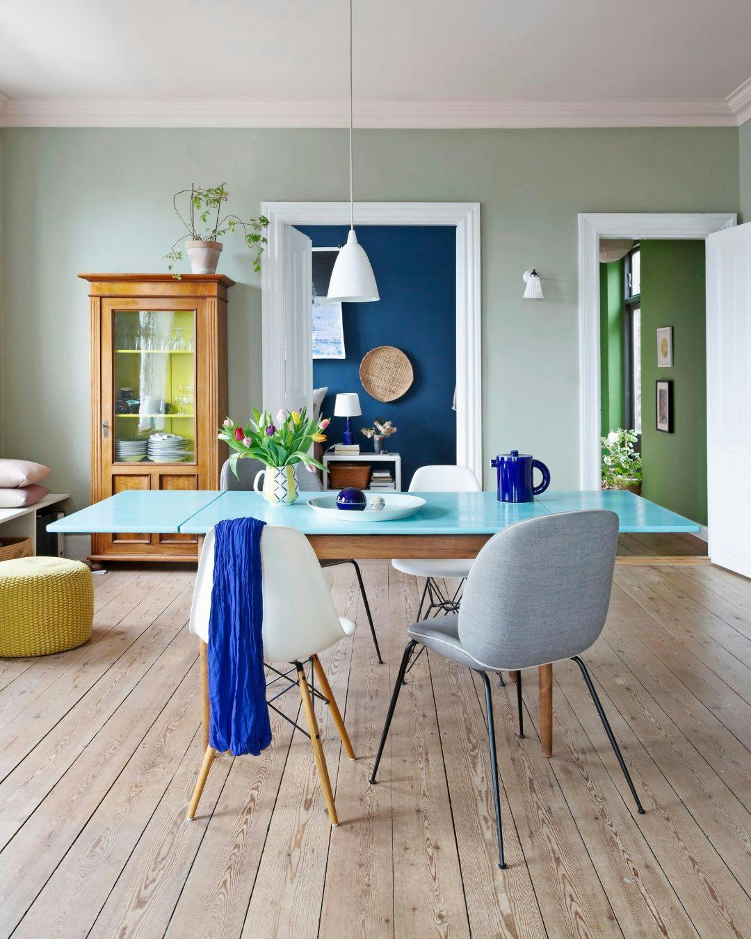 De mange farver harmonerer, fordi de alle er støvede, som her i spisestuen, hvor væggene er grønne, mens loftet er sart rosa. Den rosa har farvekode NCS S 1010-Y60R, og den grønne NCS S 3010-G80Y. Spisebordet er vintage, og skabet har Lene arvet.