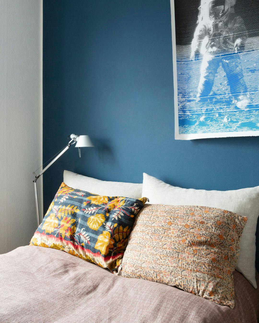 Mørke nuancer giver en omsluttende og tryg stemning og er derfor gode i soveværelser, mener Lene, der har haft den samme mørkeblå farve i en årrække. Den hedder NCS S 7020-R90B.