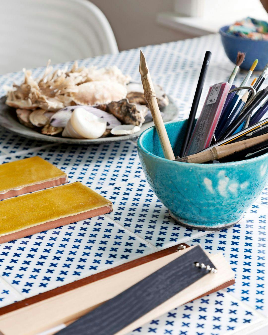 Lene havde en rest mønstrede fliser og har brugt dem som ny bordplade på sit arbejdsbord. Fadet er fyldt med strandfund fra alverdens strande. Den turkise skål har Lene formet.