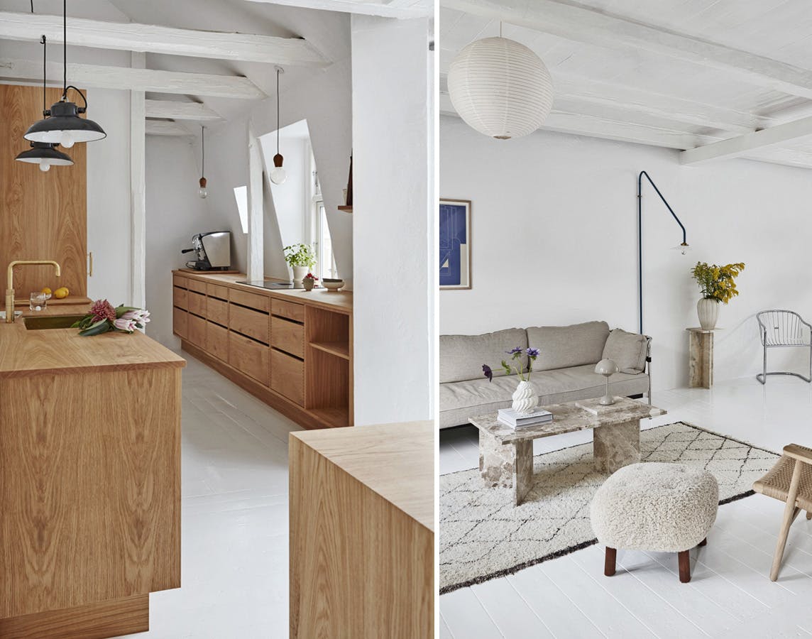 For nylig fik familien også lavet nyt snedkerkøkken i egetræ, der tilføjer en naturlig varme til det ellers hvide rum.