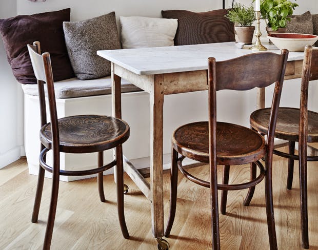 Anne Cecilie Aarfing Kiær Thomsens forelskelse i unikke fund og idéer danner også rammen om hendes yndlingssted i lejligheden: spisepladsen i køkkenet. Her har hun sammen med sin mand skabt en oase ved at rive en væg ned og inddrage et tidligere bryggers. Lejlighedens 138 kvadratmeter er desuden møbleret med vintagemøbler, arvestykker eller kunst lavet af parrets venner.