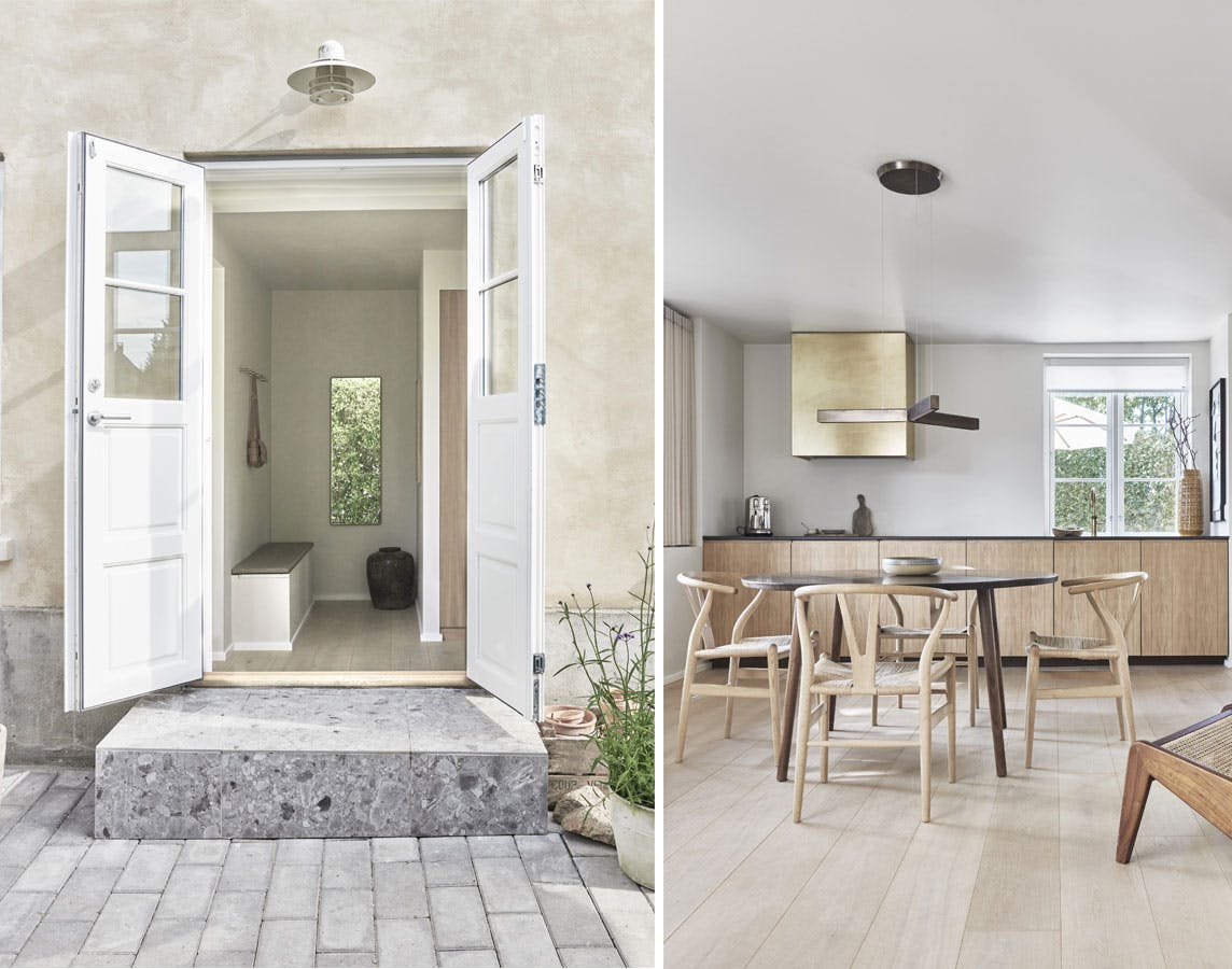 Indgangen til huset er gennem en dobbeltdør, der åbner til en lille, men velfungerende entré. Her har parret fået bygget en bænk med plads til opbevaring.