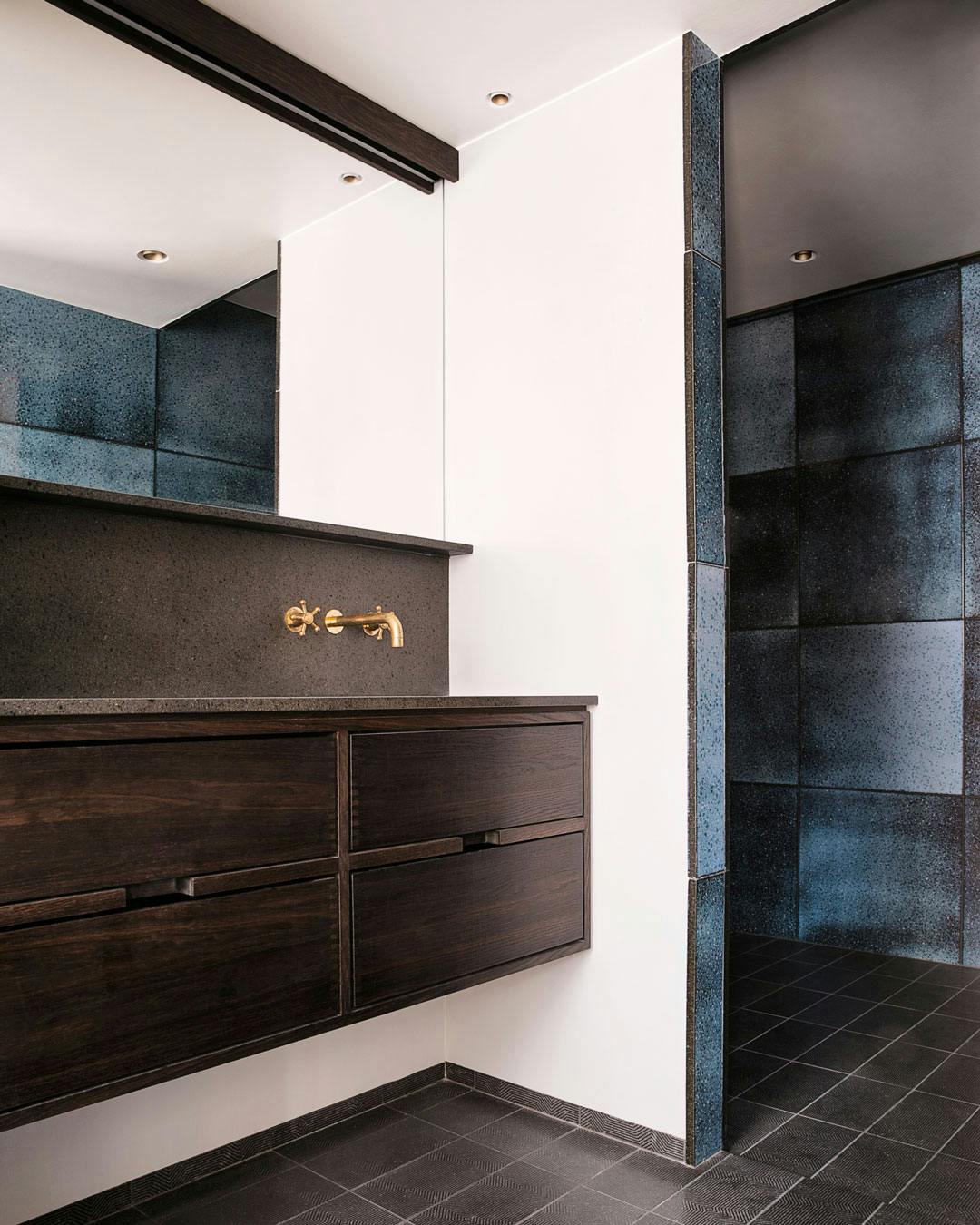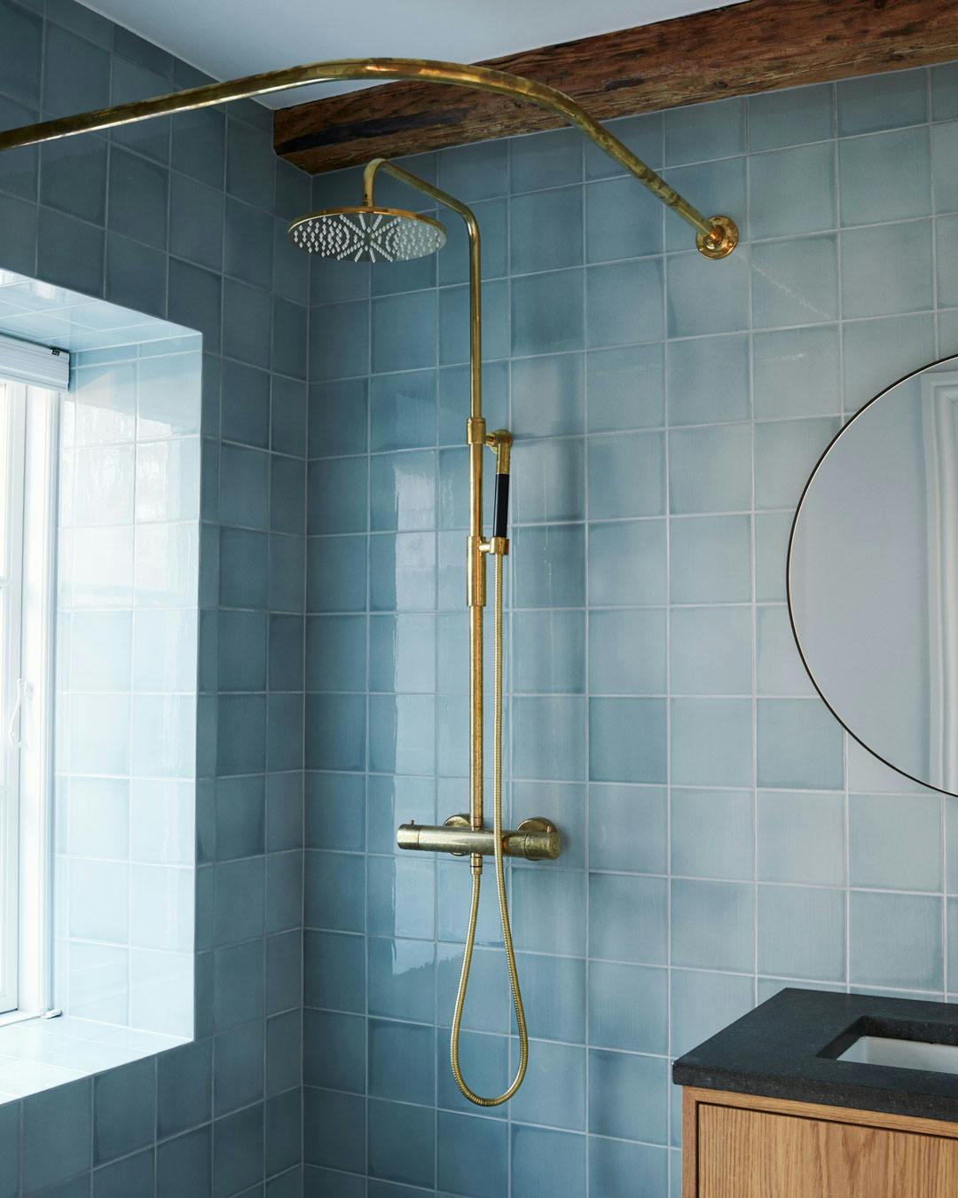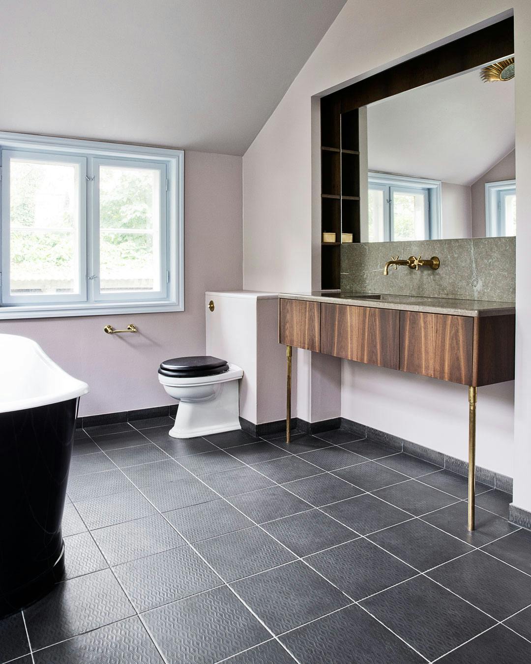 Store, kvadratiske gulvfliser i natursten skaber en smuk overflade på badeværelsesgulvet, som samtidigt giver god plads til, at rummets messingdetaljer får lov til at tiltrække sig opmærksomhed.