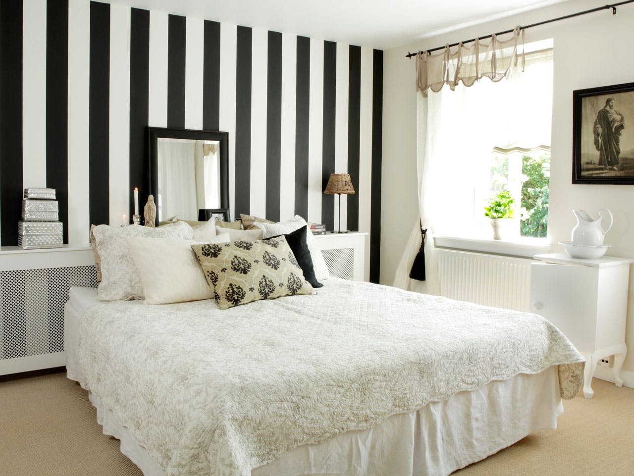 I den mere moderne version af den romantiske stil, kan du tone lidt ned for blomsterne eller helt undlade blomster. Tapetser evt. endevæggen med sort-hvid-stribet tapet. Hold resten af soveværelset mest i hvidt med enkelte sorte detaljer. Sæt en romantisk lampe til og læg et sengetæppe med blonder på. Sølvæsker og sølvlysestager vil være fine detaljer i denne stil, som bliver moderne og en smule pompøs.