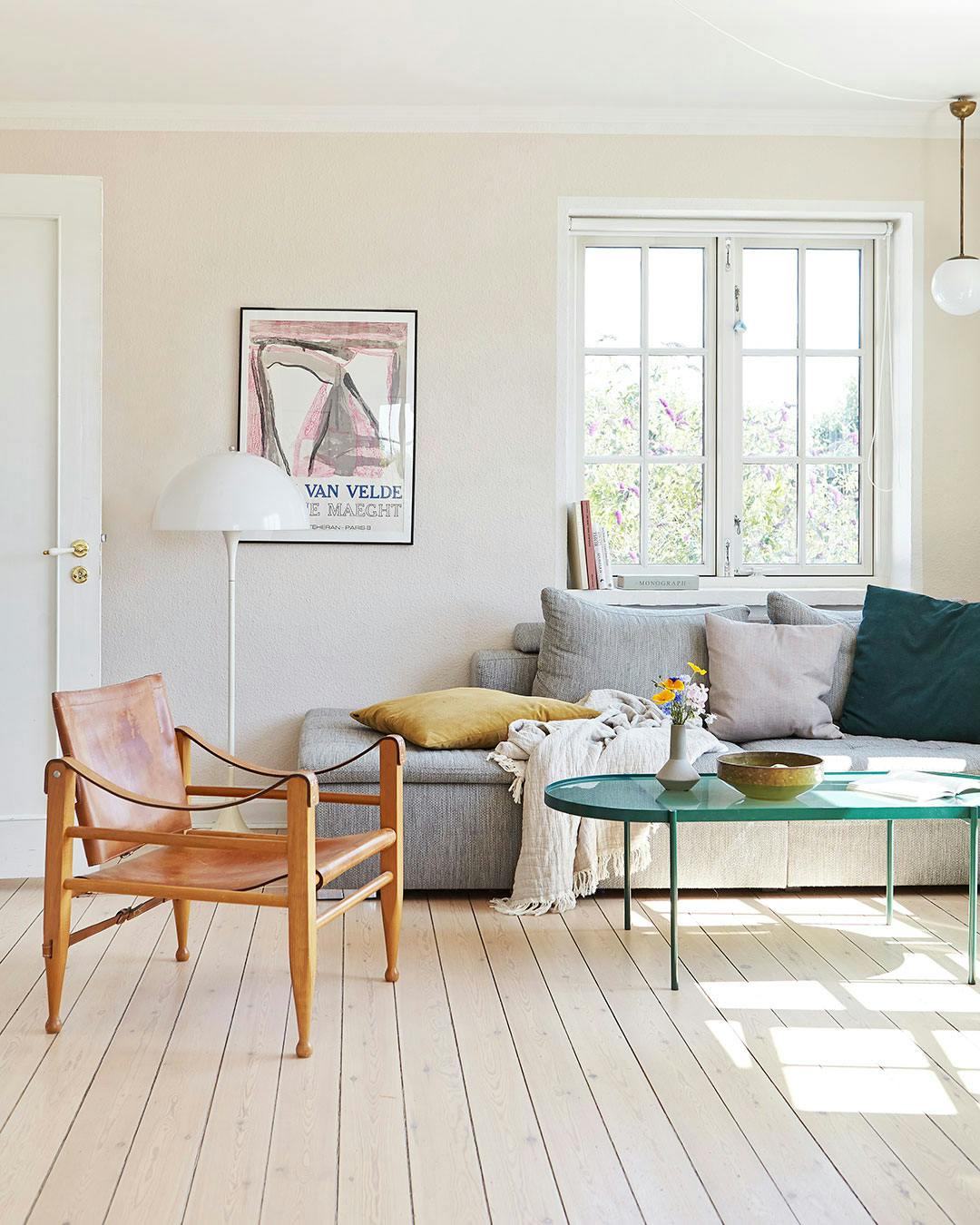 Skab sammenhæng i indretningen ved at vælge to-tre farver, der går igen. Som her, hvor det grønne sofabord er forbundet med puden i sofaen. Bordet her er fra Hübsch.